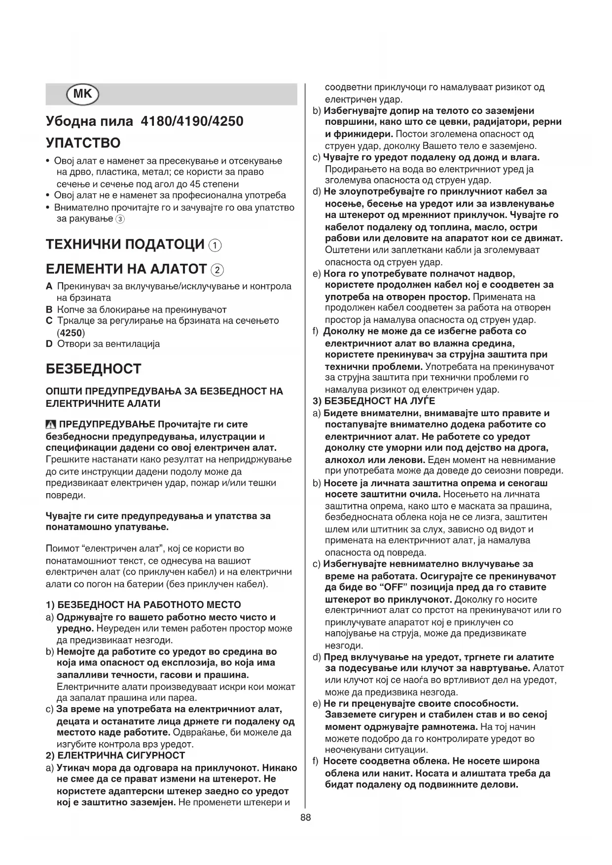 - Внимателно прочитајте го и зачувајте го ова упатство за ракување 3 ТЕХНИЧКИ ПОДАТОЦИ 1 ЕЛЕМЕНТИ НА АЛАТОТ 2 A Прекинувач за вклучување/исклучување и контрола на брзината B Копче за блокирање на прекинувачот C Тркалце за регулирање на брзината на сечењето (4250) D Отвори за вентилација