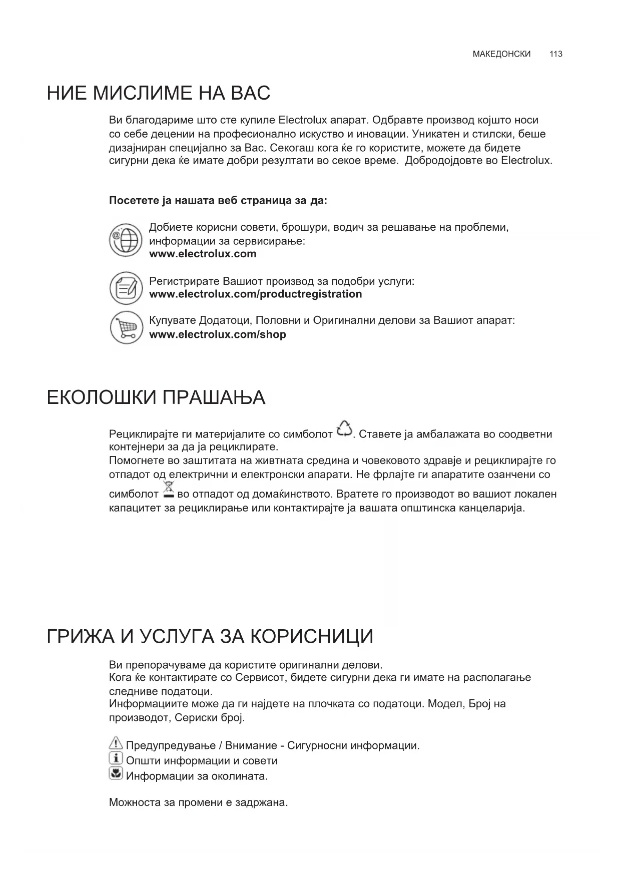 НИЕ МИСЛИМЕ НА ВАС Ви благодариме што сте купиле Electrolux апарат. Одбравте производ којшто носи со себе децении на професионално искуство и иновации. Уникатен и стилски, беше дизајниран специјално за Вас. Секогаш кога ќе го користите, можете да бидете сигурни дека ќе имате добри резултати во секое време. Добродојдовте во Electrolux. Посетете ја нашата веб страница за