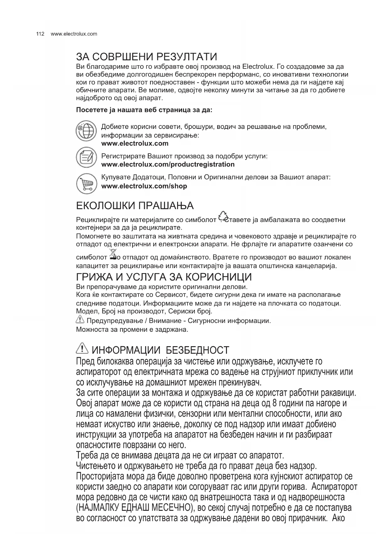 ЗА СОВРШЕНИ РЕЗУЛТАТИ Ви благодариме што го избравте овој производ на Electrolux. Го создадовме за да ви обезбедиме долгогодишен беспрекорен перформанс, со иновативни технологии кои го прават животот поедноставен - функции што можеби нема да ги најдете кај обичните апарати. Ве молиме, одвојте неколку минути за читање за да го добиете најдоброто од овој апарат. Посетете ја нашата веб страница за да: Добиете корисни совети, брошури, водич за решавање на проблеми, информации за сервисирање: www.electrolux.com Регистрирате Вашиот производ за подобри услуги: www.electrolux.com/productregistration Купувате Додатоци, Половни и Оригинални делови за Вашиот апарат: www.electrolux.com/shop ЕКОЛОШКИ ПРАШАЊА Рециклирајте ги материјалите со симболот . Ставете ја амбалажата во соодветни контејнери за да ја рециклирате. Помогнете во заштитата на живтната средина и човековото здравје и рециклирајте го отпадот од електрични и електронски апарати. Не фрлајте ги апаратите озанчени со симболот во отпадот од домаќинството. Вратете го производот во вашиот локален капацитет за рециклирање или контактирајте ја вашата општинска канцеларија. ГРИЖА И УСЛУГА ЗА КОРИСНИЦИ Ви препорачуваме да користите оригинални делови. Кога ќе контактирате со Сервисот, бидете сигурни дека ги имате на располагање следниве податоци. Информациите може да ги најдете на плочката со податоци. Модел, Број на производот, Сериски број. Предупредување / Внимание - Сигурносни информации. Можноста за промени е задржана. ИНФОРМАЦИИ БЕЗБЕДНОСТ Пред билокаква операција за чистење или одржување, исклучете го аспираторот од електричната мрежа со вадење на струјниот приклучник или со исклучување на домашниот мрежен прекинувач. За сите операции за монтажа и одржување да се користат работни ракавици. Овој апарат може да се користи од страна на деца од 8 години па нагоре и лица со намалени физички, сензорни или ментални способности, или ако немаат искуство или знаење, доколку се под надзор или имаат добиено инструкции за употреба на апаратот на безбеден начин и ги разбираат опасностите поврзани со него. Треба да се внимава децата да не си играат со апаратот. Чистењето и одржувањето не треба да го прават деца без надзор. Просторијата мора да биде доволно проветрена кога кујнскиот аспиратор се користи заедно со апарати кои согоруваат гас или други горива. Аспираторот мора редовно да се чисти како од внатрешноста така и од надворешноста (НАЈМАЛКУ ЕДНАШ МЕСЕЧНО), во секој случај потребно е да се постапува во согласност со упатствата за одржување дадени во овој прирачник. Ако MK УПАТСТВО ЗА КОРИСНИК113