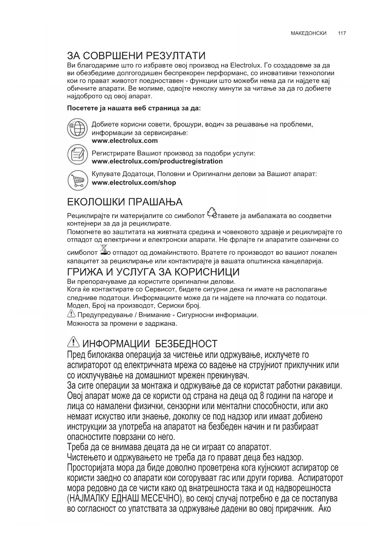 ЗА СОВРШЕНИ РЕЗУЛТАТИ Ви благодариме што го избравте овој производ на Electrolux. Го создадовме за да ви обезбедиме долгогодишен беспрекорен перформанс, со иновативни технологии кои го прават животот поедноставен - функции што можеби нема да ги најдете кај обичните апарати. Ве молиме, одвојте неколку минути за читање за да го добиете најдоброто од овој апарат. Посетете ја нашата веб страница за да: Добиете корисни совети, брошури, водич за решавање на проблеми, информации за сервисирање: www.electrolux.com Регистрирате Вашиот производ за подобри услуги: www.electrolux.com/productregistration Купувате Додатоци, Половни и Оригинални делови за Вашиот апарат: www.electrolux.com/shop ЕКОЛОШКИ ПРАШАЊА Рециклирајте ги материјалите со симболот . Ставете ја амбалажата во соодветни контејнери за да ја рециклирате. Помогнете во заштитата на живтната средина и човековото здравје и рециклирајте го отпадот од електрични и електронски апарати. Не фрлајте ги апаратите озанчени со симболот во отпадот од домаќинството. Вратете го производот во вашиот локален капацитет за рециклирање или контактирајте ја вашата општинска канцеларија. ГРИЖА И УСЛУГА ЗА КОРИСНИЦИ Ви препорачуваме да користите оригинални делови. Кога ќе контактирате со Сервисот, бидете сигурни дека ги имате на располагање следниве податоци. Информациите може да ги најдете на плочката со податоци. Модел, Број на производот, Сериски број. Предупредување / Внимание - Сигурносни информации. Можноста за промени е задржана. ИНФОРМАЦИИ БЕЗБЕДНОСТ Пред билокаква операција за чистење или одржување, исклучете го аспираторот од електричната мрежа со вадење на струјниот приклучник или со исклучување на домашниот мрежен прекинувач. За сите операции за монтажа и одржување да се користат работни ракавици. Овој апарат може да се користи од страна на деца од 8 години па нагоре и лица со намалени физички, сензорни или ментални способности, или ако немаат искуство или знаење, доколку се под надзор или имаат добиено инструкции за употреба на апаратот на безбеден начин и ги разбираат опасностите поврзани со него. Треба да се внимава децата да не си играат со апаратот. Чистењето и одржувањето не треба да го прават деца без надзор. Просторијата мора да биде доволно проветрена кога кујнскиот аспиратор се користи заедно со апарати кои согоруваат гас или други горива. Аспираторот мора редовно да се чисти како од внатрешноста така и од надворешноста (НАЈМАЛКУ ЕДНАШ МЕСЕЧНО), во секој случај потребно е да се постапува во согласност со упатствата за одржување дадени во овој прирачник. Ако MK УПАТСТВО ЗА КОРИСНИКwww.electrolux.com