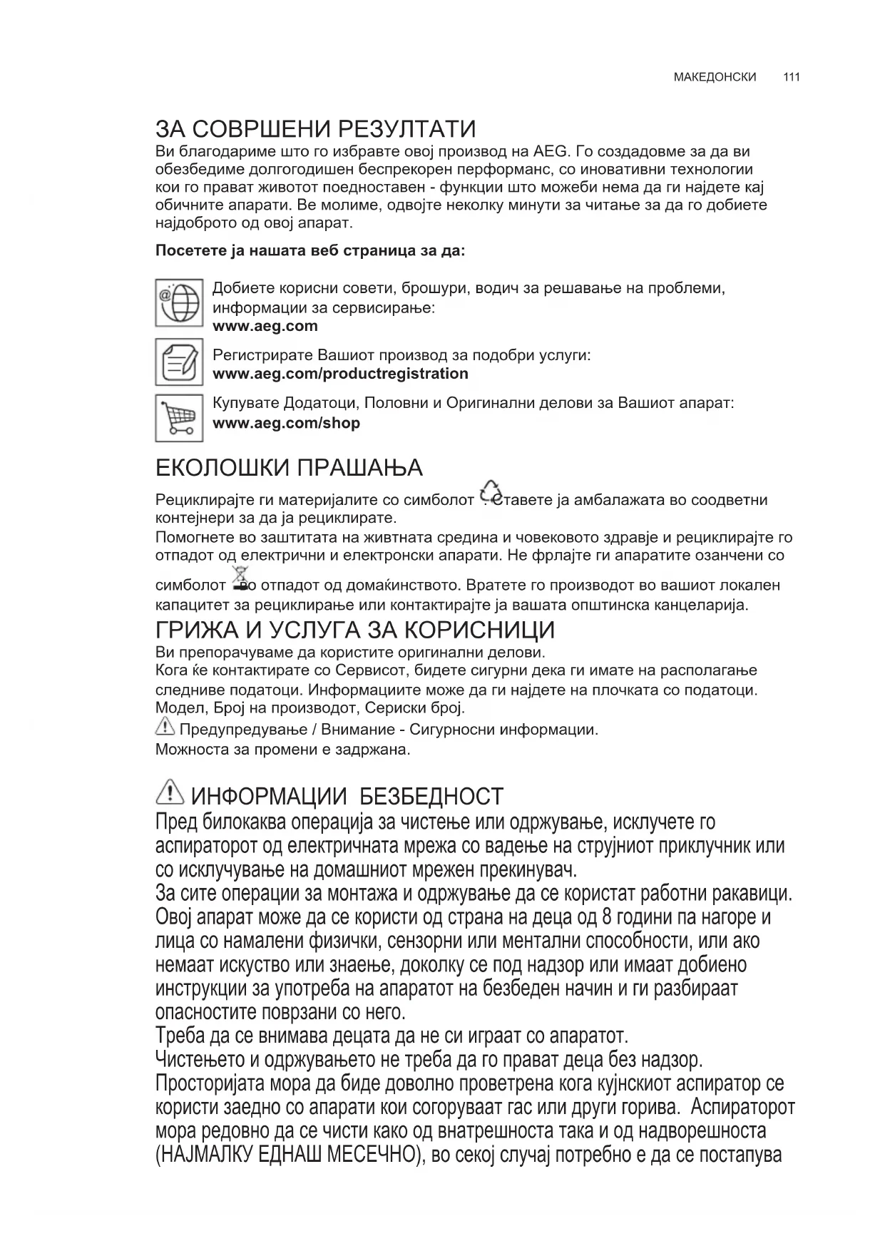 ЗА СОВРШЕНИ РЕЗУЛТАТИ Ви благодариме што го избравте овој производ на AEG. Го создадовме за да ви обезбедиме долгогодишен беспрекорен перформанс, со иновативни технологии кои го прават животот поедноставен - функции што можеби нема да ги најдете кај обичните апарати. Ве молиме, одвојте неколку минути за читање за да го добиете најдоброто од овој апарат. Посетете ја нашата веб страница за да: Добиете корисни совети, брошури, водич за решавање на проблеми, информации за сервисирање: www.aeg.com Регистрирате Вашиот производ за подобри услуги: www.aeg.com/productregistration Купувате Додатоци, Половни и Оригинални делови за Вашиот апарат: www.aeg.com/shop ЕКОЛОШКИ ПРАШАЊА Рециклирајте ги материјалите со симболот . Ставете ја амбалажата во соодветни контејнери за да ја рециклирате. Помогнете во заштитата на живтната средина и човековото здравје и рециклирајте го отпадот од електрични и електронски апарати. Не фрлајте ги апаратите озанчени со симболот во отпадот од домаќинството. Вратете го производот во вашиот локален капацитет за рециклирање или контактирајте ја вашата општинска канцеларија. ГРИЖА И УСЛУГА ЗА КОРИСНИЦИ Ви препорачуваме да користите оригинални делови. Кога ќе контактирате со Сервисот, бидете сигурни дека ги имате на располагање следниве податоци. Информациите може да ги најдете на плочката со податоци. Модел, Број на производот, Сериски број. Предупредување / Внимание - Сигурносни информации. Можноста за промени е задржана. ИНФОРМАЦИИ БЕЗБЕДНОСТ Пред билокаква операција за чистење или одржување, исклучете го аспираторот од електричната мрежа со вадење на струјниот приклучник или со исклучување на домашниот мрежен прекинувач. За сите операции за монтажа и одржување да се користат работни ракавици. Овој апарат може да се користи од страна на деца од 8 години па нагоре и лица со намалени физички, сензорни или ментални способности, или ако немаат искуство или знаење, доколку се под надзор или имаат добиено инструкции за употреба на апаратот на безбеден начин и ги разбираат опасностите поврзани со него. Треба да се внимава децата да не си играат со апаратот. Чистењето и одржувањето не треба да го прават деца без надзор. Просторијата мора да биде доволно проветрена кога кујнскиот аспиратор се користи заедно со апарати кои согоруваат гас или други горива. Аспираторот мора редовно да се чисти како од внатрешноста така и од надворешноста (НАЈМАЛКУ ЕДНАШ МЕСЕЧНО), во секој случај потребно е да се постапува MK УПАТСТВО ЗА КОРИСНИКwww.aeg.com