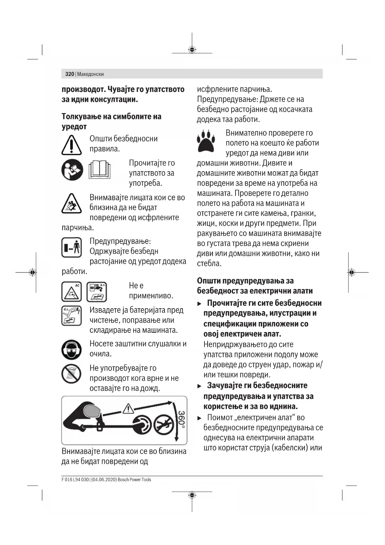 Безбедносни напомени Предупредување! Ве молиме прочитајте ги следниве упатства. Запознајте се со контролите и правилната употреба на Bosch Power Tools F 016 L94 030 | (04.06.2020)320 | Македонски производот. Чувајте го упатството за идни консултации. Толкување на симболите на