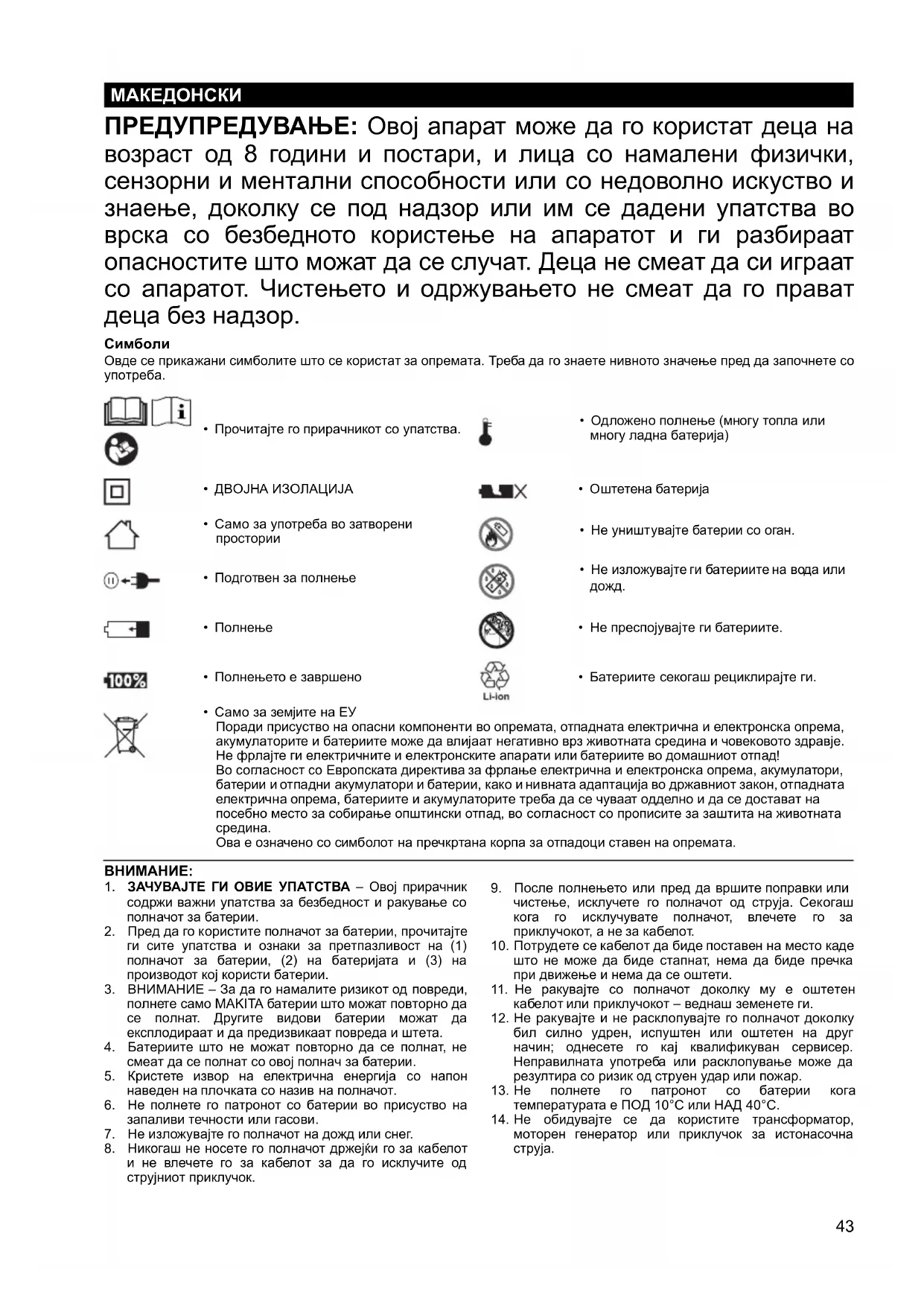 полнете само MAKITA батерии што можат повторно да се полнат. Другите видови батерии можат да експлодираат и да предизвикаат повреда и штета.