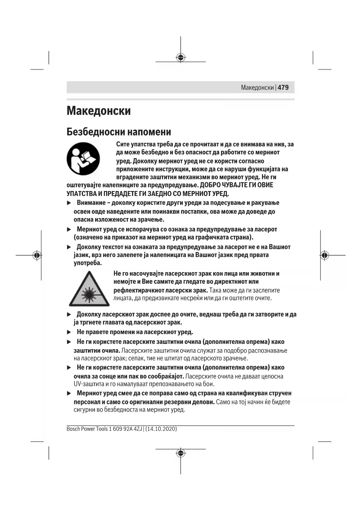 Не го насочувајте ласерскиот зрак кон лица или животни и немојте и Вие самите да гледате во директниот или рефлектирачкиот ласерски зрак. Така може да ги заслепите лицата, да предизвикате несреќи или да ги оштетите очите. u Доколку ласерскиот зрак доспее до очите, веднаш треба да ги затворите и да ја тргнете главата од ласерскиот зрак. u Не правете промени на ласерскиот уред. u Не ги користете ласерските заштитни очила (дополнителна опрема) како заштитни очила. Ласерските заштитни очила служат за подобро распознавање на ласерскиот зрак; сепак, тие не штитат од ласерското зрачење. u Не ги користете ласерските заштитни очила (дополнителна опрема) како очила за сонце или пак во сообраќајот. Ласерските очила не даваат целосна UV-заштита и го намалуваат препознавањето на бои. u Мерниот уред смее да се поправа само од страна на квалификуван стручен персонал и само со оригинални резервни делови. Само на тој начин ќе бидете сигурни во безбедноста на мерниот уред. Bosch Power Tools 1 609 92A 4ZJ | (14.10.2020)480 | Македонски u Не ги оставајте децата да го користат ласерскиот мерен уред без надзор. Без надзор, тие може да се заслепат себеси или други лица. u Не работете со мерниот уред во околина каде постои опасност од експлозија, каде има запаливи течности, гас или прашина. Мерниот уред создава искри, кои може да ја запалат правта или пареата. u Не ја отворајте батеријата. Постои опасност од краток спој. u При оштетување и непрописна употреба на батеријата може да излезе пареа. Батеријата може да се запали или да експлодира. Внесете свеж воздух и доколку има повредени однесете ги на лекар. Пареата може да ги надразни дишните патишта. u При погрешно користење или при оштетена батерија може да истече запалива течност од батеријата. Избегнувајте контакт со неа. Доколку случајно дојдете во контакт со течноста, исплакнете со вода. Доколку течноста дојде во контакт со очите, побарајте лекарска помош. Истечената течност од батеријата може да предизвика кожни иритации или изгореници. u Батеријата може да се оштети од острите предмети како на пр. клинци или одвртувач или со надворешно влијание. Може да дојде до внатрешен краток спој и батеријата може да се запали, да пушти чад, да експлодира или да се