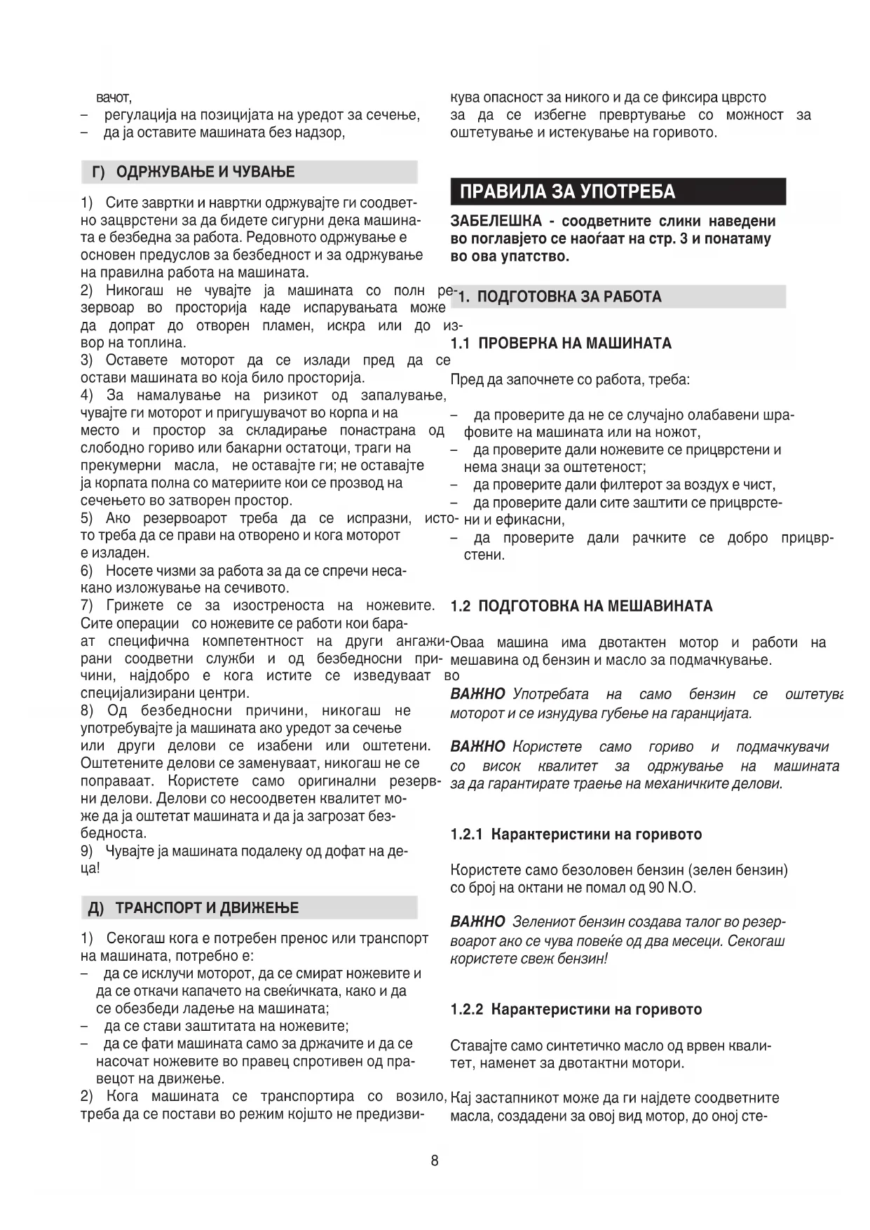 Д) ТРАНСПОРТ И ДВИЖЕЊЕ 1) Секогаш кога е потребен пренос или транспорт на машината, потребно е: – да се исклучи моторот, да се смират ножевите и да се откачи капачето на свеќичката, како и да се обезбеди ладење на машината; – да се стави заштитата на ножевите; – да се фати машината само за држачите и да се насочат ножевите во правец спротивен од пра- вецот на движење. 2) Кога машината се транспортира со возило, треба да се постави во режим којшто не предизви- кува опасност за никого и да се фиксира цврсто за да се избегне превртување со можност за оштетување и истекување на горивото. ПРАВИЛА ЗА УПОТРЕБА ЗАБЕЛЕШКА - соодветните слики наведени во поглавјето се наоѓаат на стр. 3 и понатаму во ова упатство.