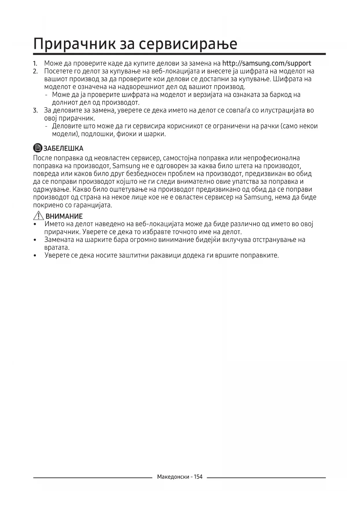 После поправка од неовластен сервисер, самостојна поправка или непрофесионална поправка на производот, Samsung не е одговорен за каква било штета на производот, повреда или каков било друг безбедносен проблем на производот, предизвикан во обид да се поправи производот којшто не ги следи внимателно овие упатства за поправка и одржување. Какво било оштетување на производот предизвикано од обид да се поправи производот од страна на некое лице кое не е овластен сервисер на Samsung, нема да биде покриено со гаранцијата.
