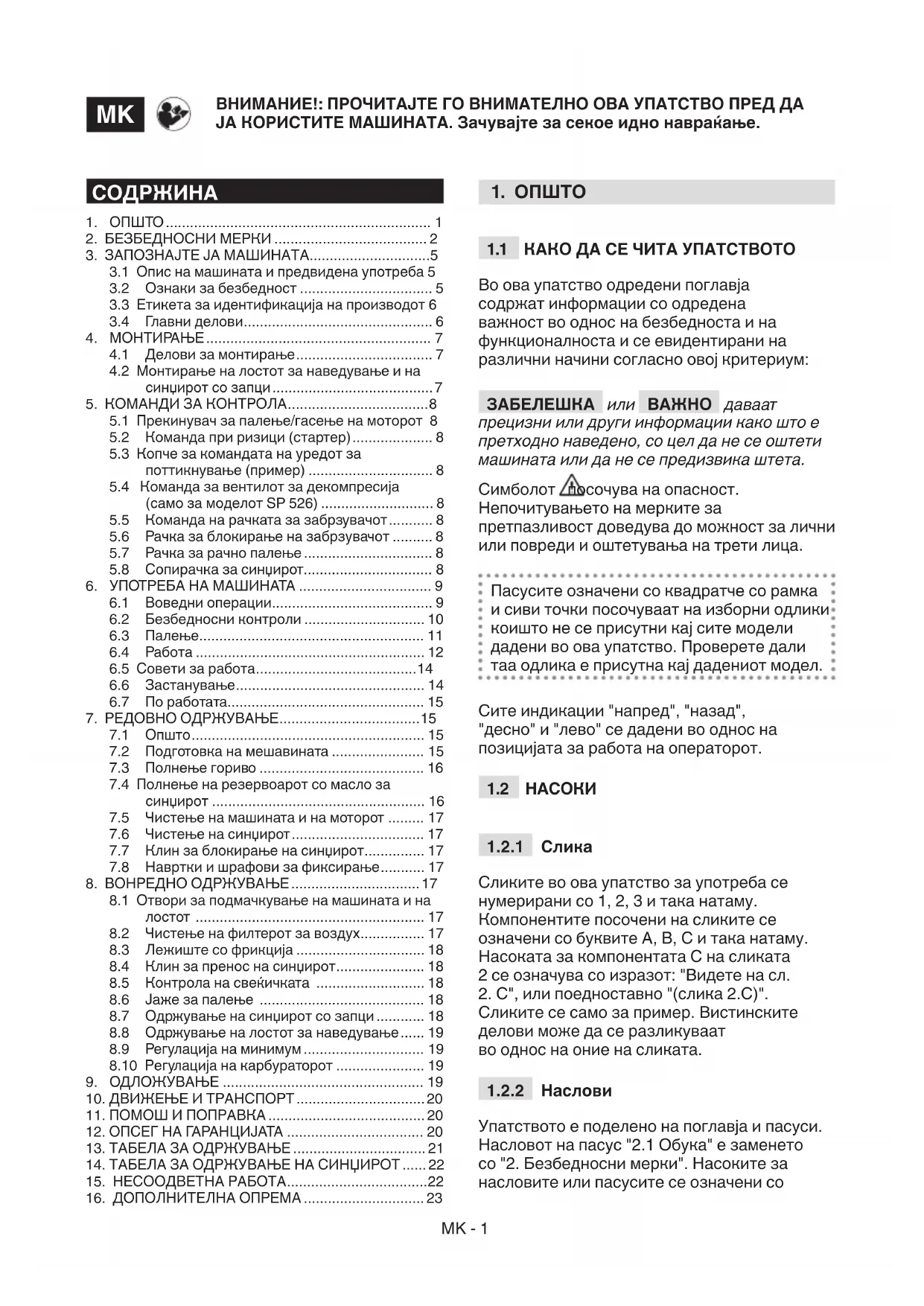 Упатството е поделено на поглавја и пасуси. Насловот на пасус "2.1 Обука" е заменето со "2. Безбедносни мерки". Насоките за насловите или пасусите се означени со ВНИМАНИЕ!: ПРОЧИТАЈТЕ ГО ВНИМАТЕЛНО ОВА УПАТСТВО ПРЕД ДА ЈА КОРИСТИТЕ МАШИНАТА. Зачувајте за секое идно навраќање.