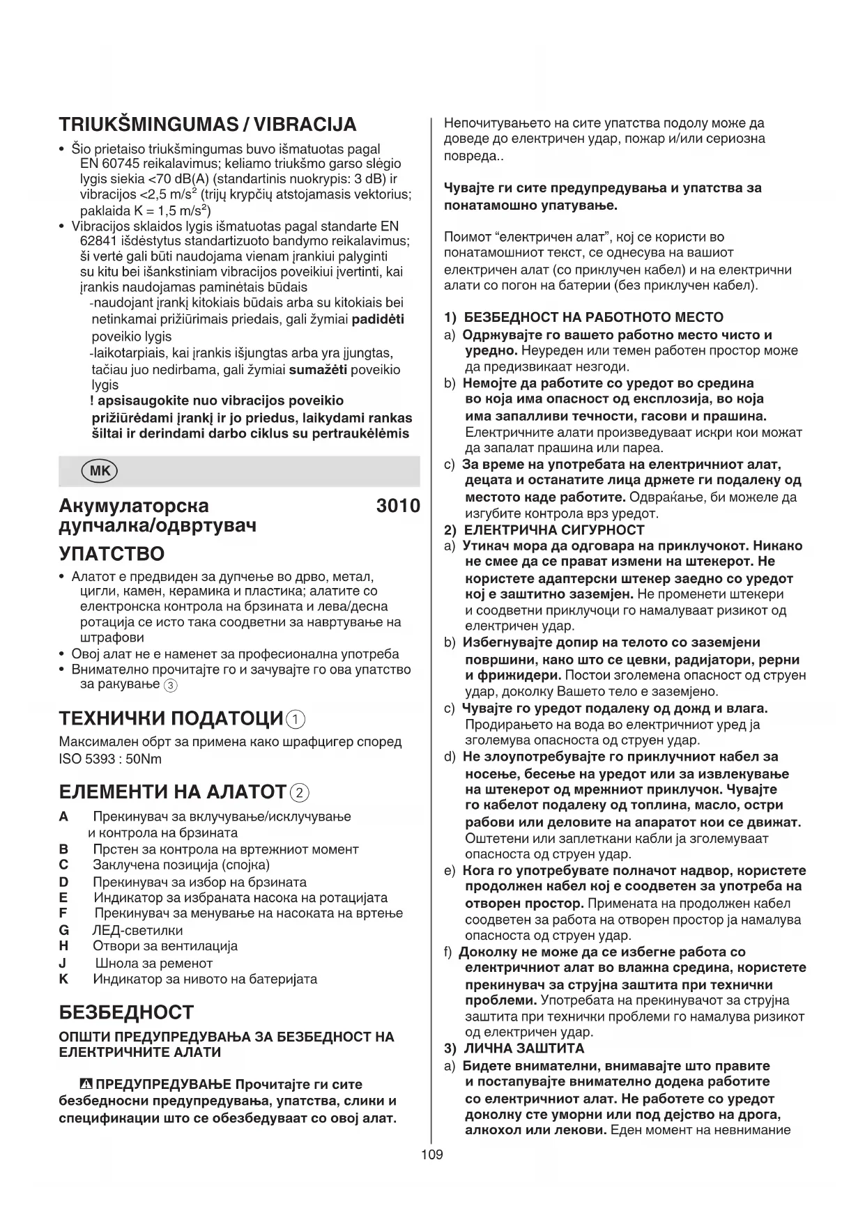 - Мерено во согласност со EN 60745 нивото на звучен притисок е <70 dB(A) (стандардно отстапување: 3 dB) и вибрација <2.5 м/с² (векторски збир на трите показатели; несигурност К = 1.5 м/с²)
