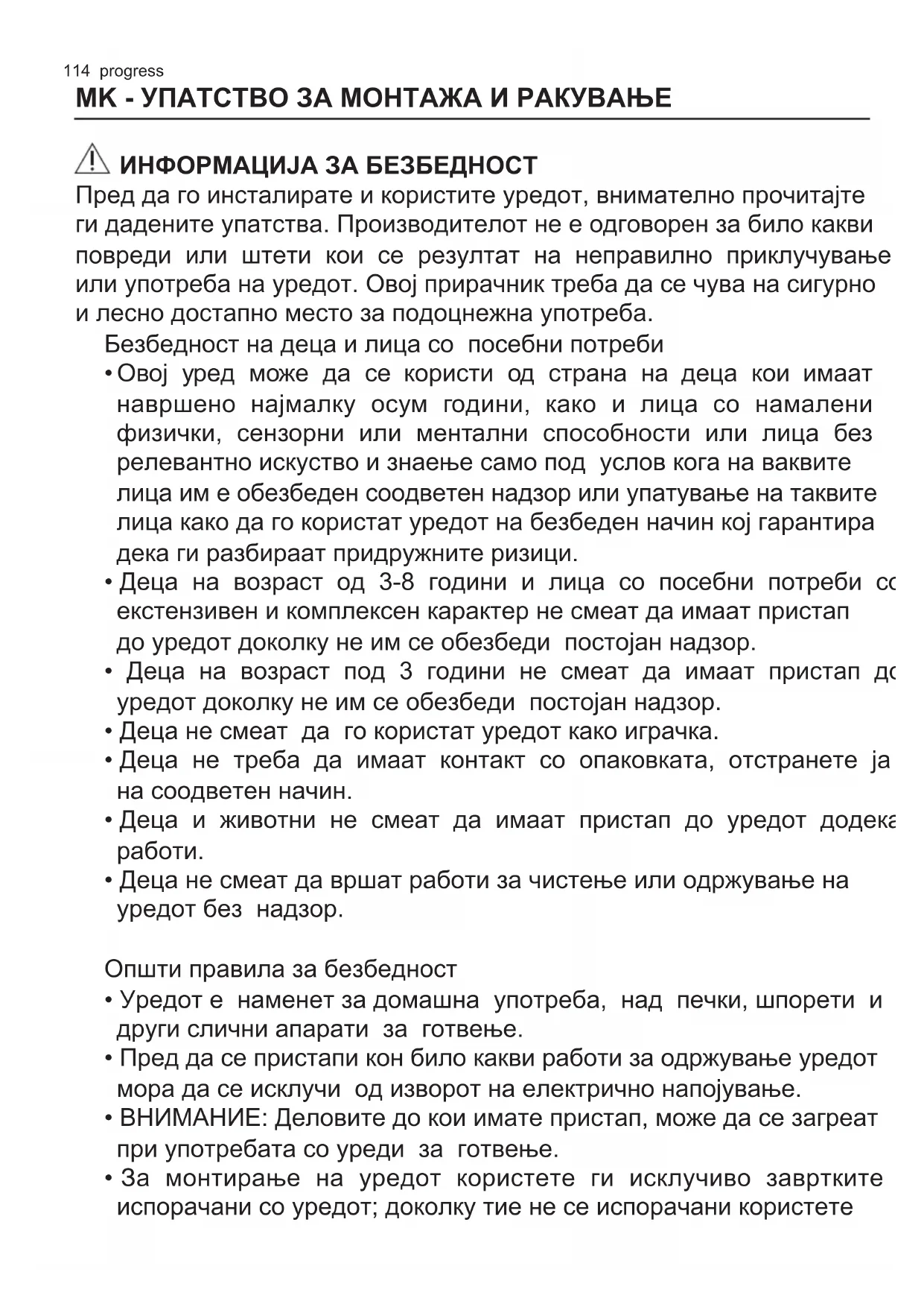 - За монтирање на уредот користете ги исклучиво завртките испорачани со уредот; доколку тие не се испорачани користетеprogress 115 завртки препорачани во инструкциите за инсталација.