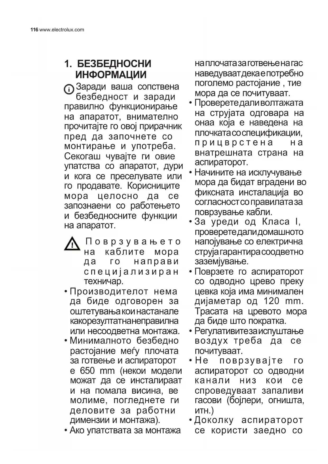 - Доколку аспираторот се користи заедно со117117MACEDONIAN уред кој не работи на електрична струја (на пример, уред на гас), мора да се обезбеди доволен степен на вентилација во просторијата за да се спречи враќање назад на издувните гасови. Кога аспираторот се користи заедно со апарати кои не работат на електрична струја, негативниот притисок во просторијата не смее да биде поголем од 0,04 mbar, со цел да се спречи враќање на издувните гасови назад во просторијата од страна на аспираторот.