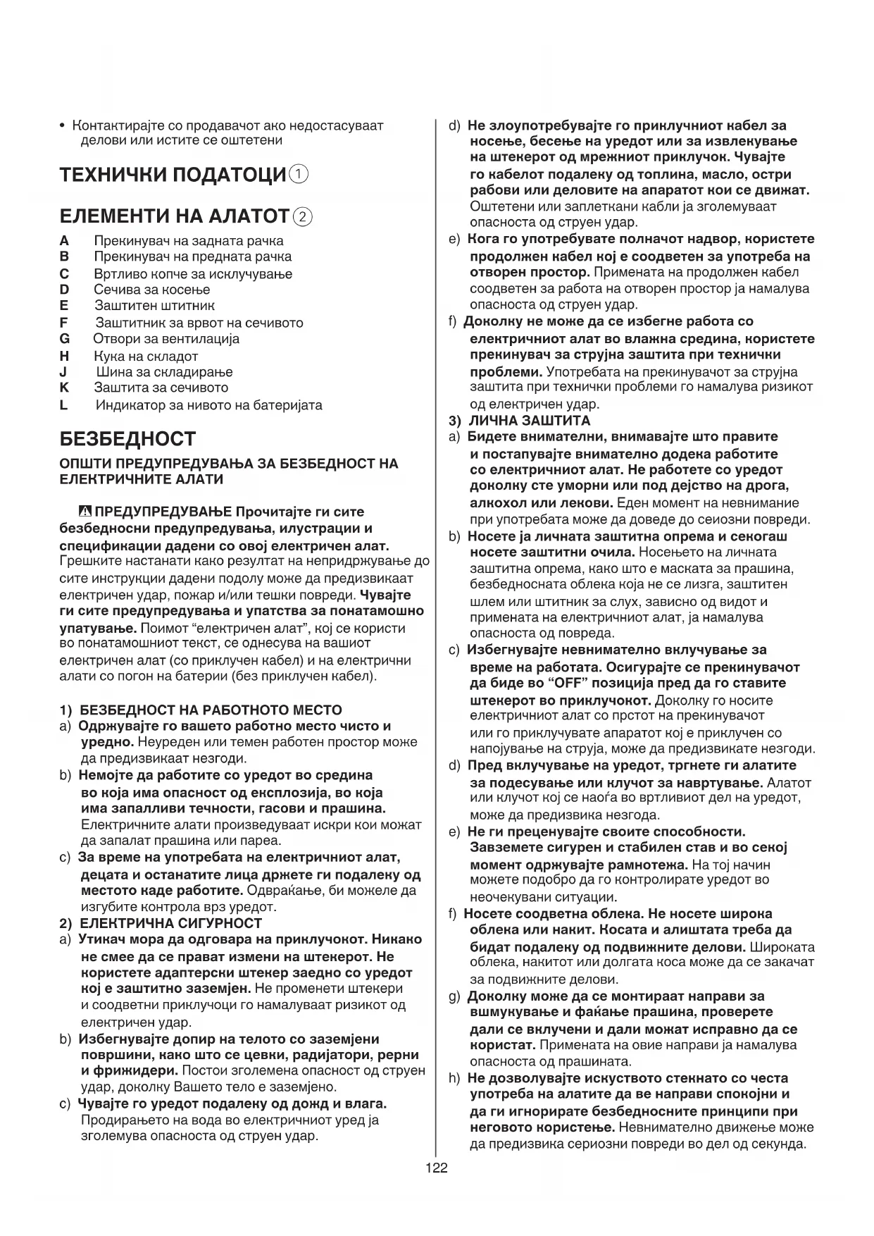 СПЕЦИФИЧНИ БЕЗБЕДНОСНИ УПАТСТВА ЗА ПОТКАСТРУВАЧИТЕ НА ЖИВА ОГРАДА a) Делови од телото не смеат да дојдат близу сечилото. Не отстранувајте поткастрен материјал и не држете материјал што треба да се поткаструва додека се движат сечилата. Сечилата продолжуваат да се движат и по исклучување на алатот. Момент на невнимание при работење со поткаструвач на жива ограда може да доведе до сериозна повреда. b) Поткаструвачот на жива ограда треба да се носи за рачката, со запрени сечила, и внимавајте да не притиснете некој прекинувач. Со правилно носење на поткаструвачот на жива ограда ќе се намали ризикот од случајно вклучување на алатот, а со тоа и повреда од сечилата. c) При транспорт или складирање на поткаструвачот на жива ограда, секогаш ставајте ја навлаката за сечила. Со соодветно ракување со поткаструвачот на жива ограда се намалува ризикот за лична повреда од сечилата. d) При чистење заглавен материјал или при сервисирање на уредот, уверете се дека се исклучени сите прекинувачи и дека е отстранета или исклучена батеријата. Неочекуваното вклучување на поткаструвачот на жива ограда при чистење заглавен материјал или при сервисирање може да предизвика сериозни повреди.