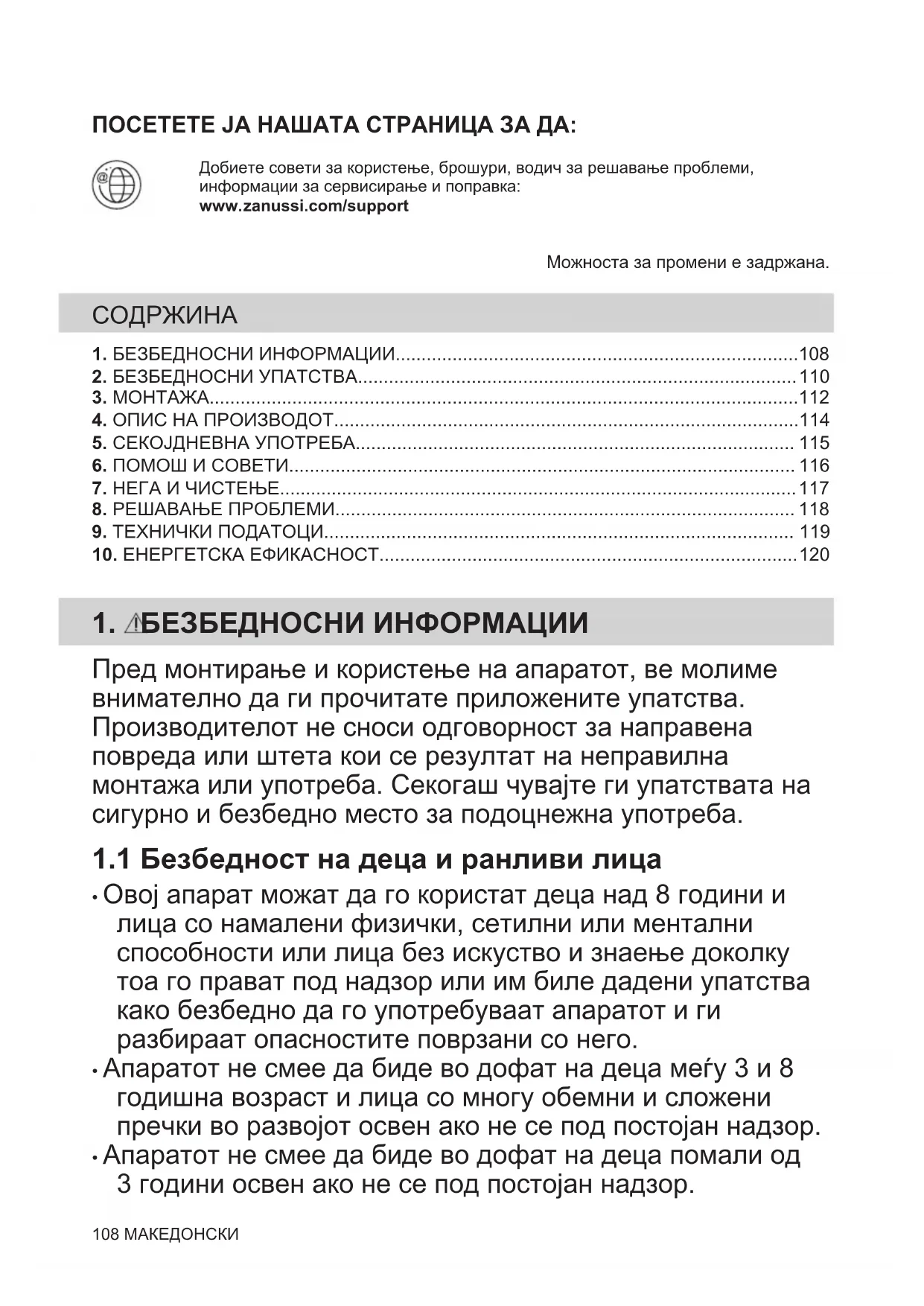 120 МАКЕДОНСКИ11. ГРИЖА ЗА ОКОЛИНАТА Рециклирајте ги материјалите со симболот . Ставете ја амбалажата во соодветни контејнери за да ја рециклирате. Помогнете во заштитата на живтната средина и човековото здравје и рециклирајте го отпадот од електрични и електронски апарати. Не фрлајте ги апаратите озанчени со симболот во отпадот од домаќинството. Вратете го производот во вашиот локален капацитет за рециклирање или контактирајте ја вашата општинска канцеларија. МАКЕДОНСКИ 121VIZITAȚI WEBSITE-UL NOSTRU PENTRU: A găsi sfaturi privind utilizarea, broșuri, informații pentru depanare, service și reparații:www.zanussi.com/supportNe rezervãm dreptul asupra efectuãrii de modificãri. CUPRINS
