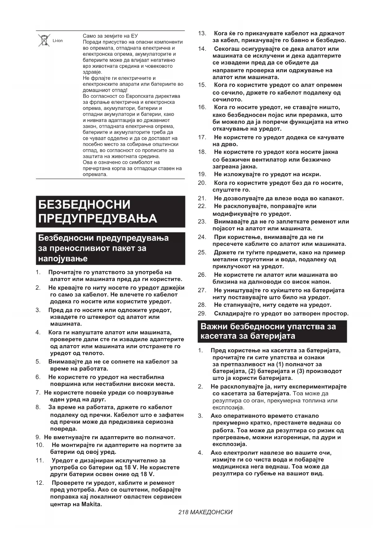 ЧУВАЈТЕ ГО УПАТСТВОТО. ВНИМАНИЕ: Користете само оригинални батерии на Makita.Користењетонеоригинални батериинаMakitaилибатерииштосеизменети можедарезултирасораспукувањенабатеријата, предизвикувајќипожар,телеснаповредаи оштетување.Тоаистотакаќејапоништи гаранцијатанаMakitaзаалатотиполначотна Makita. Совети за одржување максимален работен век на