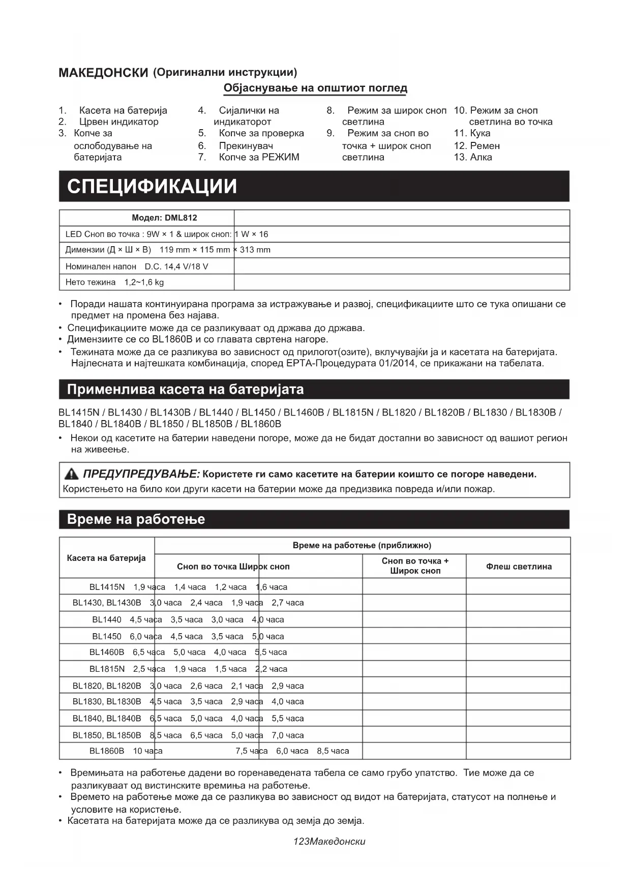 - Тежинатаможедасеразликувавозависностодприлогот(озите),вклучувајќијаикасетатанабатеријата. Најлеснатаинајтешкатакомбинација,споредEPTA-Процедурата01/2014,сеприкажанинатабелата. Применлива касета на батеријата BL1415N/BL1430/BL1430B/BL1440/BL1450/BL1460B/BL1815N/BL1820/BL1820B/BL1830/BL1830B/ BL1840/BL1840B/BL1850/BL1850B/BL1860B
