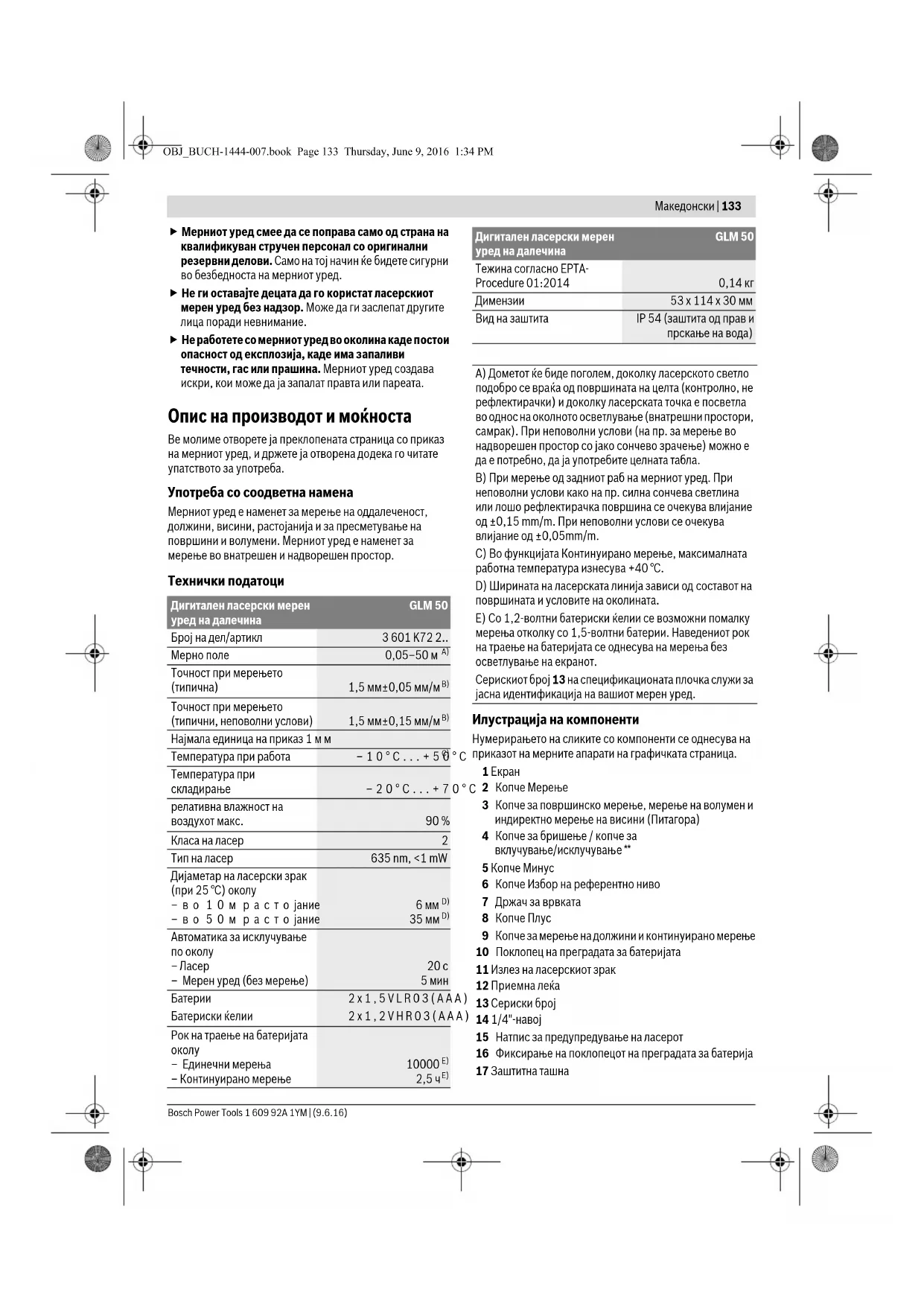 OBJ_BUCH-1444-007.book Page 132 Thursday, June 9, 2016 1:34 PMМакедонски | 133 Bosch Power Tools 1 609 92A 1YM | (9.6.16) Мерниот уред смее да се поправа само од страна на квалификуван стручен персонал со оригинални резервни делови. Само на тој начин ќе бидете сигурни во безбедноста на мерниот уред. Не ги оставајте децата да го користат ласерскиот мерен уред без надзор. Може да ги заслепат другите лица поради невнимание. Не работете со мерниот уред во околина каде постои опасност од експлозија, каде има запаливи течности, гас или прашина. Мерниот уред создава искри, кои може да ја запалат правта или пареата. Опис на производот и моќноста Ве молиме отворете ја преклопената страница со приказ на мерниот уред, и држете ја отворена додека го читате упатството за употреба. Употреба со соодветна намена Мерниот уред е наменет за мерење на оддалеченост, должини, висини, растојанија и за пресметување на површини и волумени. Мерниот уред е наменет за мерење во внатрешен и надворешен простор. Технички податоци Илустрација на компоненти Нумерирањето на сликите со компоненти се однесува на приказот на мерните апарати на графичката страница. 1 Екран 2 Копче Мерење 3 Копче за површинско мерење, мерење на волумен и индиректно мерење на висини (Питагора) 4 Копче за бришење / копче за вклучување/исклучување** 5 Копче Минус 6 Копче Избор на референтно ниво 7 Држач за врвката 8 Копче Плус 9 Копче за мерење на должини и континуирано мерење 10 Поклопец на преградата за батеријата 11 Излез на ласерскиот зрак 12 Приемна леќа 13 Сериски број 14 1/4"-навој 15 Натпис за предупредување на ласерот 16 Фиксирање на поклопецот на преградата за батерија 17 Заштитна ташна Дигитален ласерски мерен уред на далечина GLM 50 Број на дел/артикл 3 601 K72 2..