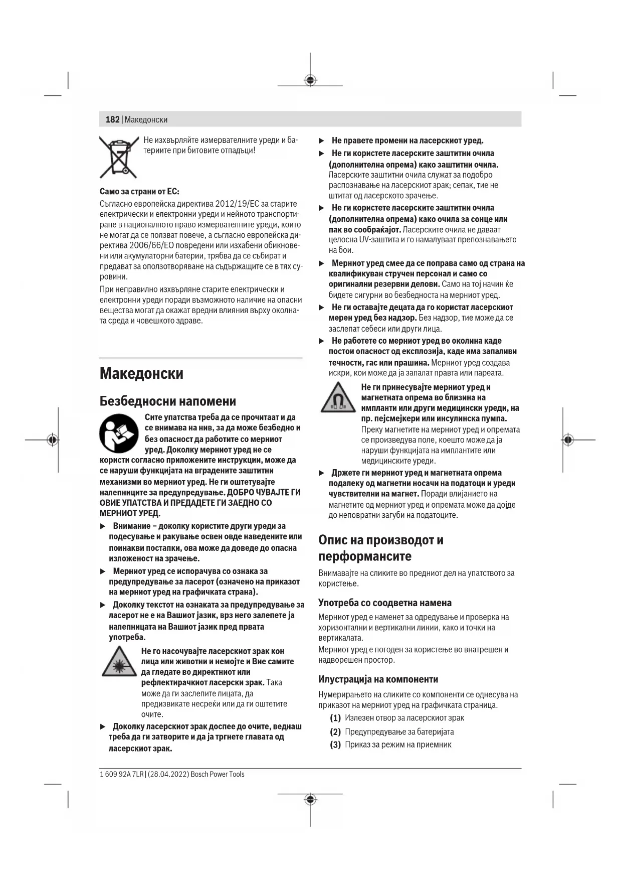 u Мерниот уред смее да се поправа само од страна на квалификуван стручен персонал и само со оригинални резервни делови. Само на тој начин ќе бидете сигурни во безбедноста на мерниот уред. u Не ги оставајте децата да го користат ласерскиот мерен уред без надзор. Без надзор, тие може да се заслепат себеси или други лица. u Не работете со мерниот уред во околина каде постои опасност од експлозија, каде има запаливи течности, гас или прашина. Мерниот уред создава искри, кои може да ја запалат правта или пареата. Не ги принесувајте мерниот уред и магнетната опрема во близина на импланти или други медицински уреди, на пр. пејсмејкери или инсулинска пумпа. Преку магнетите на мерниот уред и опремата се произведува поле, коешто може да ја наруши функцијата на имплантите или медицинските уреди. u Држете ги мерниот уред и магнетната опрема подалеку од магнетни носачи на податоци и уреди чувствителни на магнет. Поради влијанието на магнетите од мерниот уред и опремата може да дојде до неповратни загуби на податоците. Опис на производот и перформансите Внимавајте на сликите во предниот дел на упатството за
