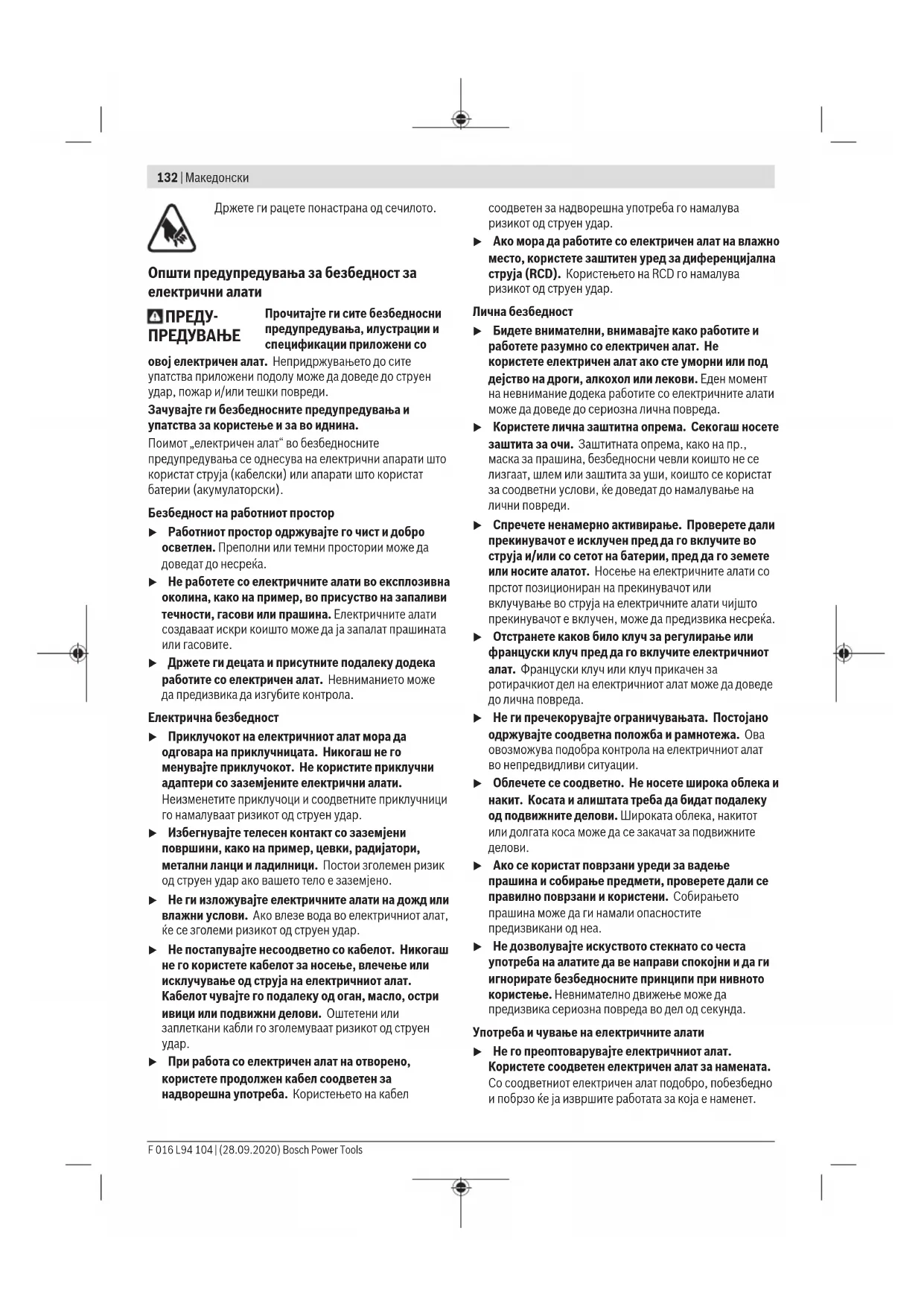 Пред секоја операција на чистење, одржување и прилагодување згаснете го уредот и исклучете го од напојување, како и кога е кабелот свиткан, притиснат или оштетен или кога го оставате производот без надзор. Bosch Power Tools F 016 L94 104 | (28.09.2020)132 | Македонски Држете ги рацете понастрана од сечилото. Општи предупредувања за безбедност за електрични алати