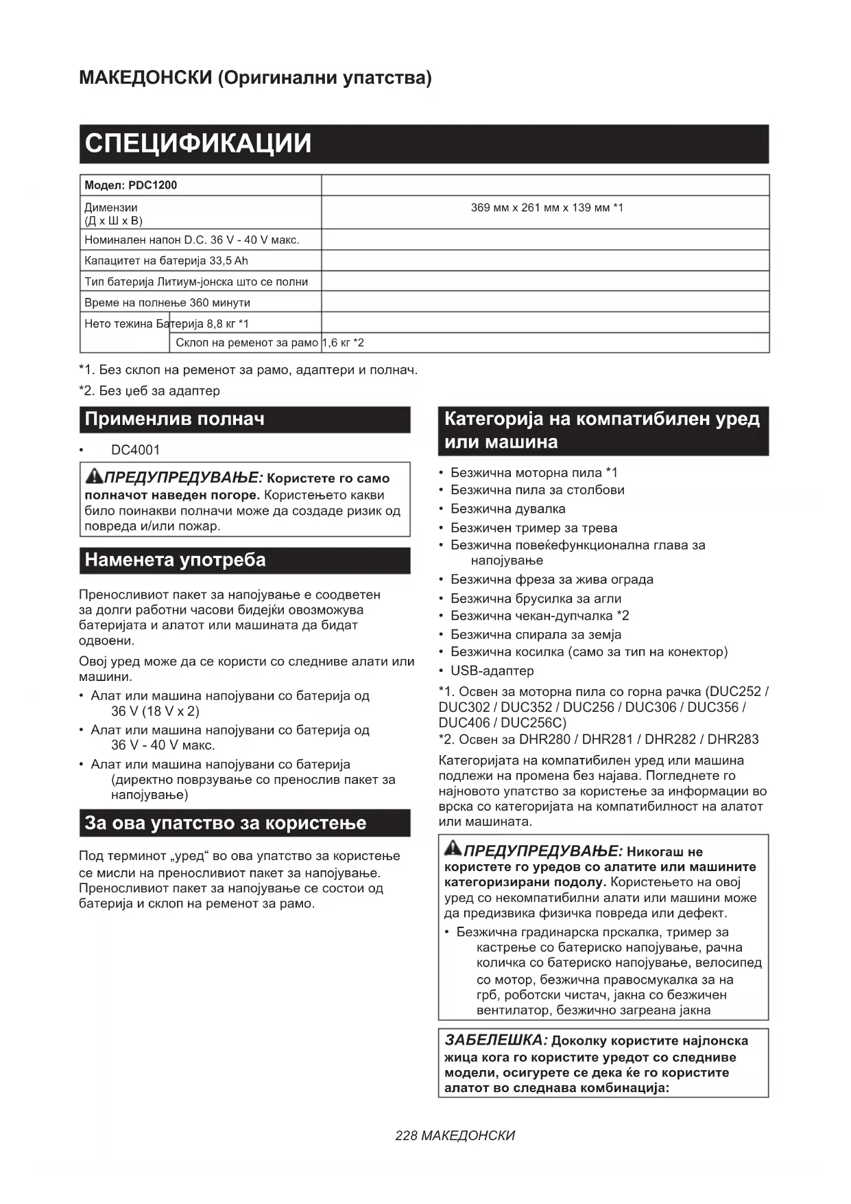 - DC4001 ПРЕДУПРЕДУВАЊЕ: Користете го само полначот наведен погоре. Користењето какви било поинакви полначи може да создаде ризик од повреда и/или пожар. Наменета употреба Преносливиот пакет за напојување е соодветен за долги работни часови бидејќи овозможува батеријата и алатот или машината да бидат