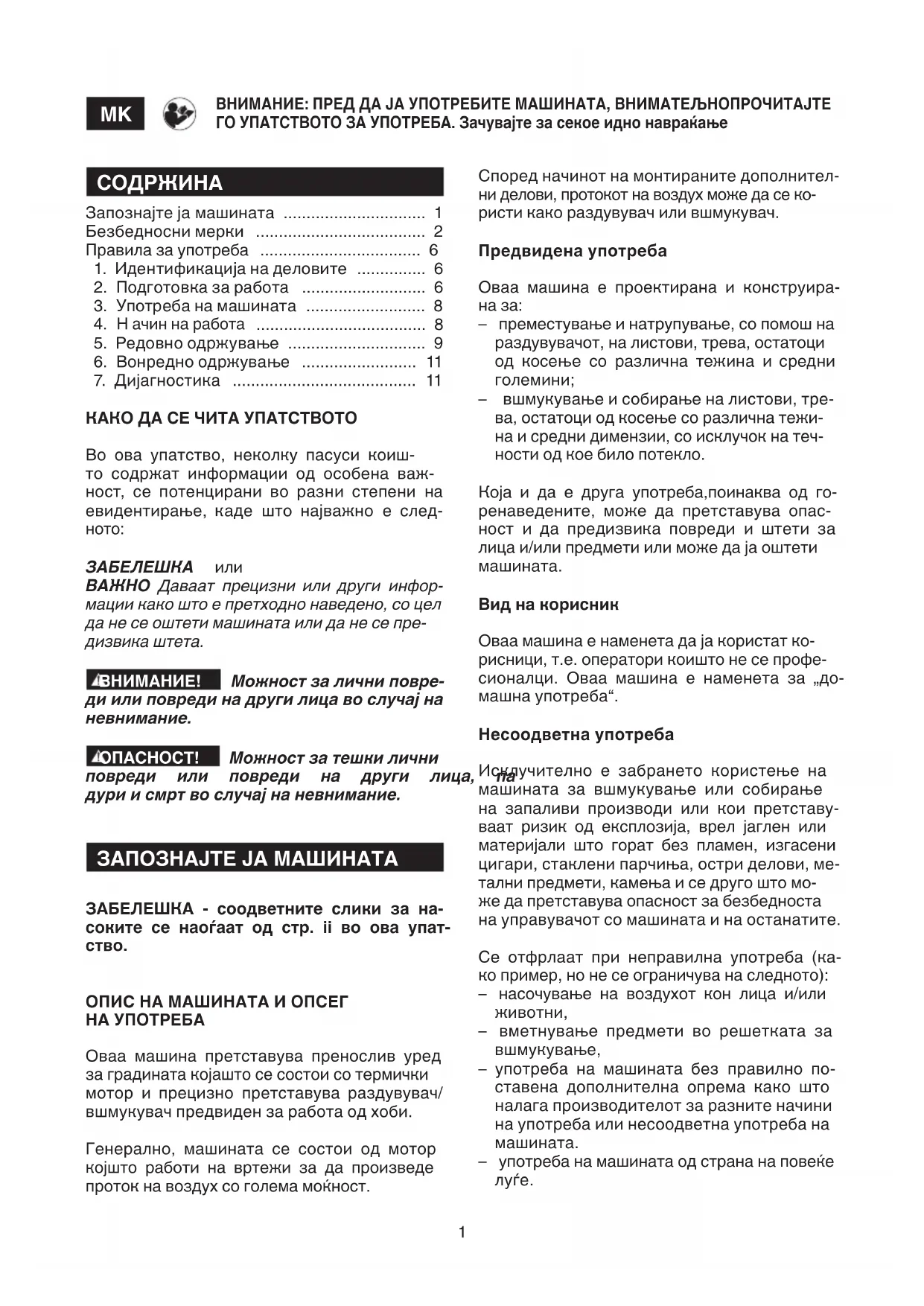 ОПИС НА МАШИНАТА И ОПСЕГ НА УПОТРЕБА Оваа машина претставува пренослив уред за градината којашто се состои со термички мотор и прецизно претставува раздувувач/ вшмукувач предвиден за работа од хоби. Генерално, машината се состои од мотор којшто работи на вртежи за да произведе проток на воздух со голема моќност. Според начинот на монтираните дополнител- ни делови, протокот на воздух може да се ко- ристи како раздувувач или вшмукувач. Предвидена употреба Оваа машина е проектирана и конструира-
