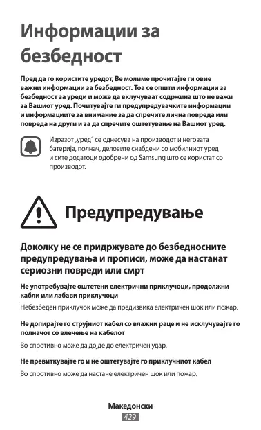 Информации за Пред да го користите уредот, Ве молиме прочитајте ги овие важни информации за безбедност. Тоа се општи информации за безбедност за уреди и може да вклучуваат содржина што не важи за Вашиот уред. Почитувајте ги предупредувачките информации и информациите за внимание за да спречите лична повреда или повреда на други и за да спречите оштетување на Вашиот уред. Изразот „уред“ се однесува на производот и неговата батерија, полнач, деловите снабдени со мобилниот уред и сите додатоци одобрени од Samsung што се користат со производот. Предупредување Доколку не се придржувате до безбедносните предупредувања и прописи, може да настанат сериозни повреди или смрт Не употребувајте оштетени електрични приклучоци, продолжни кабли или лабави приклучоци Небезбеден приклучок може да предизвика електричен шок или пожар. Не допирајте го струјниот кабел со влажни раце и не исклучувајте го полначот со влечење на кабелот Во спротивно може да дојде до електричен удар. Не превиткувајте го и не оштетувајте го приклучниот кабел Во спротивно може да настане електричен шок или пожар.