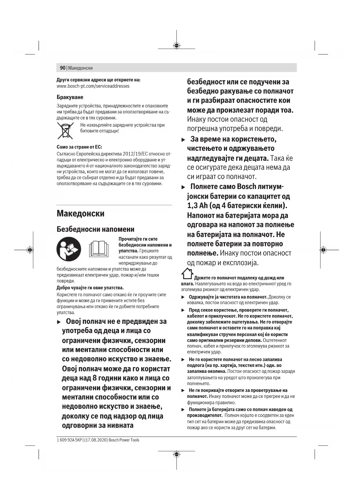 u Овој полнач не е предвиден за употреба од деца и лица со ограничени физички, сензорни или ментални способности или со недоволно искуство и знаење. Овој полнач може да го користат деца над 8 години како и лица со ограничени физички, сензорни и ментални способности или со недоволно искуство и знаење, доколку се под надзор од лица одговорни за нивната безбедност или се подучени за безбедно ракување со полначот и ги разбираат опасностите кои може да произлезат поради тоа. Инаку постои опасност од погрешна употреба и повреди. u За време на користењето, чистењето и одржувањето надгледувајте ги децата. Така ќе се осигурате дека децата нема да си играат со полначот. u Полнете само Bosch литиум- јонски батерии со капацитет од 1,3 Ah (од 4 батериски ќелии). Напонот на батеријата мора да одговара на напонот за полнење на батеријата на полначот. Не полнете батерии за повторно полнење. Инаку постои опасност од пожар и експлозија. Држете го полначот подалеку од дожд или влага. Навлегувањето на вода во електричниот уред го зголемува ризикот од електричен удар. u Одржувајте ја чистотата на полначот. Доколку се извалка, постои опасност од електричен удар. u Пред секое користење, проверете ги полначот, кабелот и приклучокот. Не го користете полначот, доколку забележите оштетувања. Не го отворајте сами полначот и оставете го на поправка кај квалификуван стручен персонал кој ќе користи само оригинални резервни делови. Оштетениот полнач, кабел и приклучок го зголемува ризикот за електричен удар. u Не го користете полначот на лесно запалива подлога (на пр. хартија, текстил итн.) одн. во запалива околина. Постои опасност од пожар заради затоплувањето на уредот што произлегува при