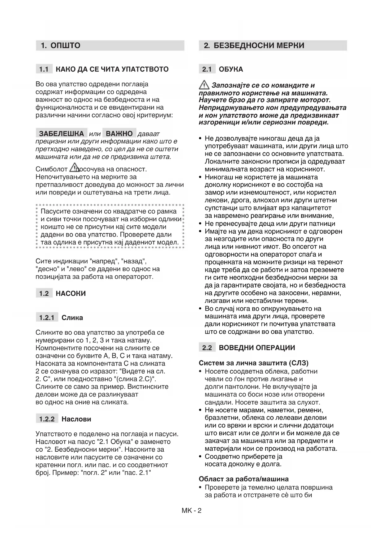 На машината има симболи (сл. 2 ). Нивната задача е да го потсетуваат операторот на постапките што треба да ги следи внимателно и со задолжителни мерки за предострожност. Значење на симболите: Внимание: Прочитајте го упатството пред да ја користите машината. Внимание: Извадете го клучот и прочитајте го упатството пред да изведувате какви било дејства за одржување или поправки. Опасност! Исфрлање предмети: Не работете ако не сте поставиле заштита со заден испуст или вреќа за собирање. (само кај модели со задно собирање). Опасност! Исфрлање предмети: Не работете без да имате поставено дефлектор со страничен испуст. (само кај модели со страничен испуст) Опасност! Исфрлање предмети: Лицата нека стојат настрана. Опасност! Превртување на машината: Не користете ја оваа машина на терени закосени повеќе од 10° Опасност! Осакатување: Обезбедете децата да стојат настрана од машината кога работи моторот Ризик од посекотини. Уред со сечиво во движење. Никогаш не ставајте ги рацете или нозете во внатрешноста каде што е сместен уредот со сечивото. Внимание! Држете растојание од топлите