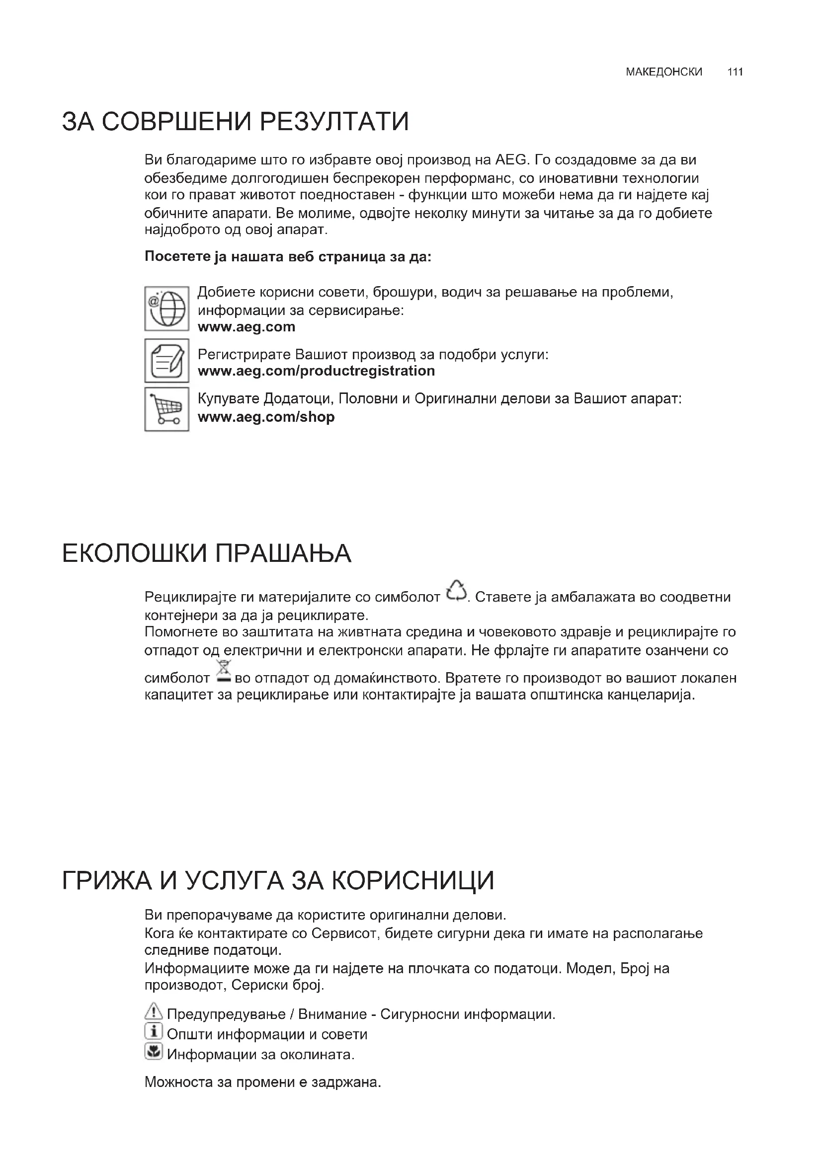 ја нашата веб страница за да: Добиете корисни совети, брошури, водич за решавање на проблеми, информации за сервисирање: www.aeg.com Регистрирате Вашиот производ за подобри услуги: www.aeg.com/productregistration Купувате Додатоци, Половни и Оригинални делови за Вашиот апарат: www.aeg.com/shop ЕКОЛОШКИ ПРАШАЊА Рециклирајте ги материјалите со симболот . Ставете ја амбалажата во соодветни контејнери за да ја рециклирате. Помогнете во заштитата на живтната средина и човековото здравје и рециклирајте го отпадот од електрични и електронски апарати. Не фрлајте ги апаратите озанчени со симболот во отпадот од домаќинството. Вратете го производот во вашиот локален капацитет за рециклирање или контактирајте ја вашата општинска канцеларија. ГРИЖА И УСЛУГА ЗА КОРИСНИЦИ Ви препорачуваме да користите оригинални делови. Кога ќе контактирате со Сервисот, бидете сигурни дека ги имате на располагање следниве податоци. Информациите може да ги најдете на плочката со податоци. Модел, Број на производот, Сериски број. Предупредување / Внимание - Сигурносни информации. Општи информации и совети Информации за околината. Можноста за промени е задржана. MK УПАТСТВО ЗА КОРИСНИКwww.aeg.com
