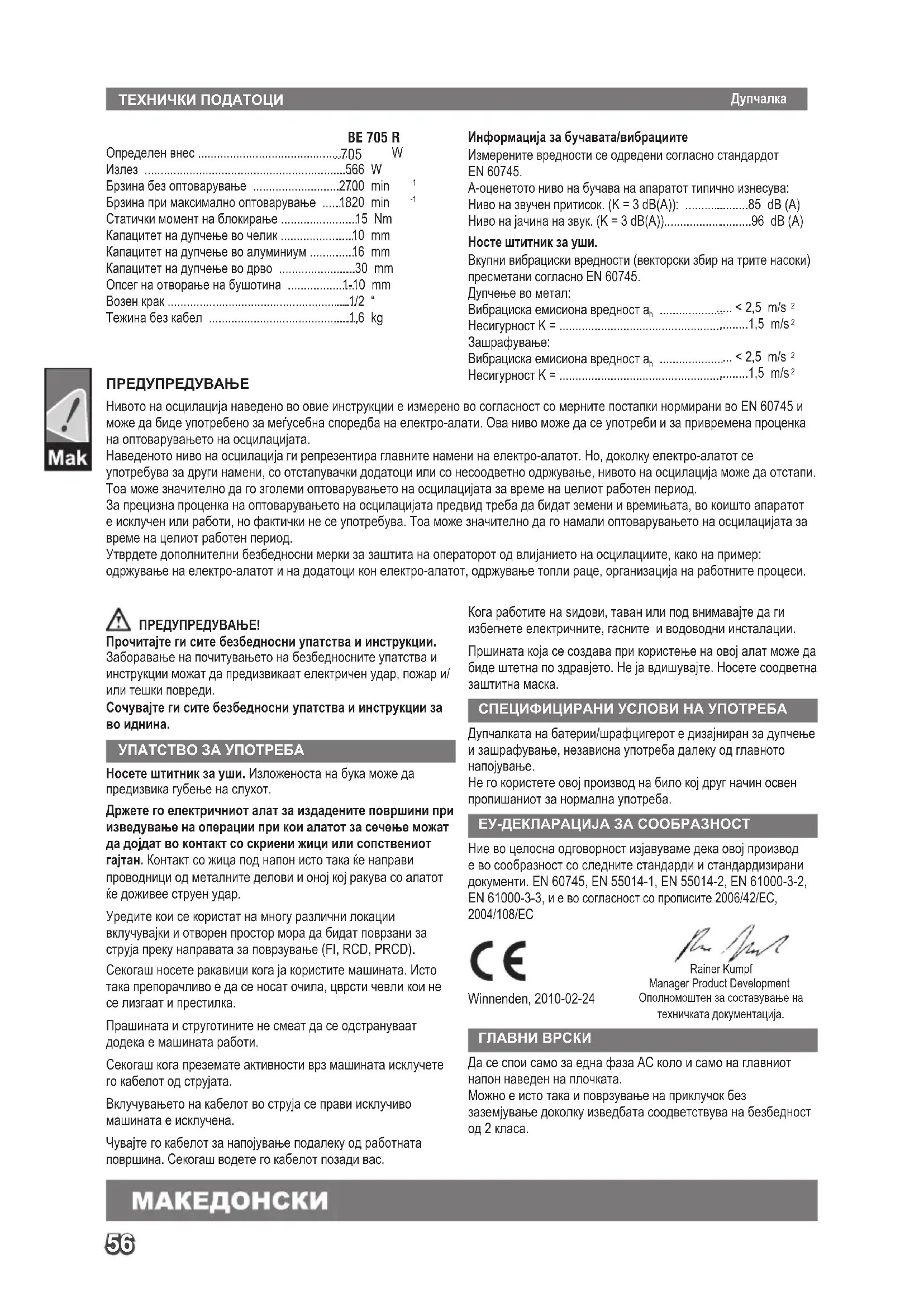 УПАТСТВО ЗА УПОТРЕБА Носете штитник за уши. Изложеноста на бука може да предизвика губење на слухот. Држете го електричниот алат за издадените површини при изведување на операции при кои алатот за сечење можат да дојдат во контакт со скриени жици или сопствениот гајтан. Контакт со жица под напон исто така ќе направи проводници од металните делови и оној кој ракува со алатот ќе доживее струен удар. Уредите кои се користат на многу различни локации вклучувајки и отворен простор мора да бидат поврзани за струја преку направата за поврзување (FI, RCD, PRCD). Секогаш носете ракавици кога ја користите машината. Исто така препорачливо е да се носат очила, цврсти чевли кои не се лизгаат и престилка. Прашината и струготините не смеат да се одстрануваат додека е машината работи. Секогаш кога преземате активности врз машината исклучете го кабелот од струјата. Вклучувањето на кабелот во струја се прави исклучиво машината е исклучена. Чувајте го кабелот за напојување подалеку од работната површина. Секогаш водете го кабелот позади вас. Кога работите на ѕидови, таван или под внимавајте да ги избегнете електричните, гасните и водоводни инсталации. Пршината која се создава при користење на овој алат може да биде штетна по здравјето. Не ја вдишувајте. Носете соодветна заштитна маска. СПЕЦИФИЦИРАНИ УСЛОВИ НА УПОТРЕБА Дупчалката на батерии/шрафцигерот е дизајниран за дупчење и зашрафување, независна употреба далеку од главното напојување. Не го користете овој производ на било кој друг начин освен пропишаниот за нормална употреба. ЕУ-ДЕКЛАРАЦИЈА ЗА СООБРАЗНОСТ Ние во целосна одговорност изјавуваме дека овој производ е во сообразност со следните стандарди и стандардизирани документи. EN 60745, EN 55014-1, EN 55014-2, EN 61000-3-2, EN 61000-3-3, и е во согласност со прописите 2006/42/EC, 2004/108/EC ГЛАВНИ ВРСКИ Да се спои само за една фаза АС коло и само на главниот напон наведен на плочката. Можно е исто така и поврзување на приклучок без заземјување доколку изведбата соодветствува на безбедност од 2 класа. Rainer Kumpf Manager Product Development Ополномоштен за составување на техничката документација. Winnenden, 2010-02-24 Дупчалка57