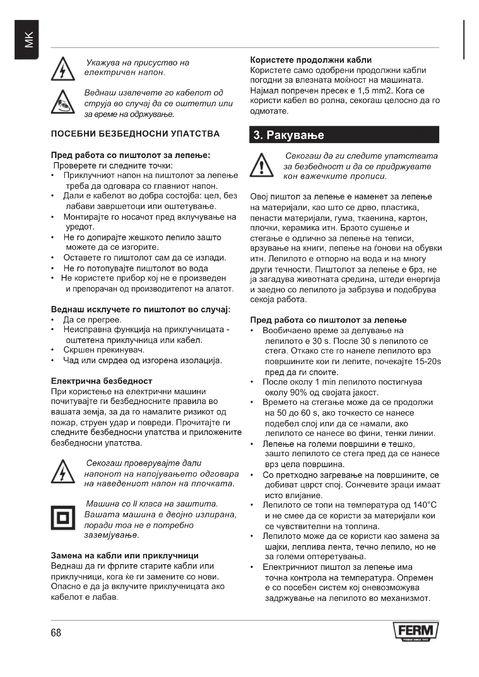 Укажуванаприсуствона електриченнапон. Веднашизвлечетегокабелотод струјавослучајдасеоштетилили завременаодржување. ПОСЕБНИ БЕЗБЕДНОСНИ УПАТСТВА Пред работа со пиштолот за лепење: Проверете ги следните точки: