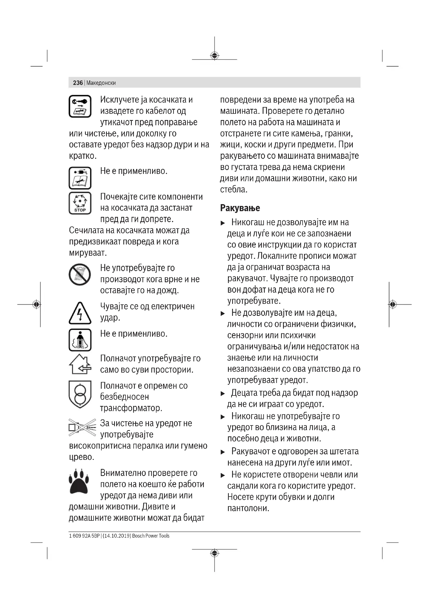 Предупредување: Не допирајте ги ротирачките сечила. Сечилата се оштри. Чувајте се од загуба на прстите. Bosch Power Tools 1 609 92A 5BP | (14.10.2019)236 | Македонски Исклучете ја косачката и извадете го кабелот од утикачот пред поправање или чистење, или доколку го оставате уредот без надзор дури и на