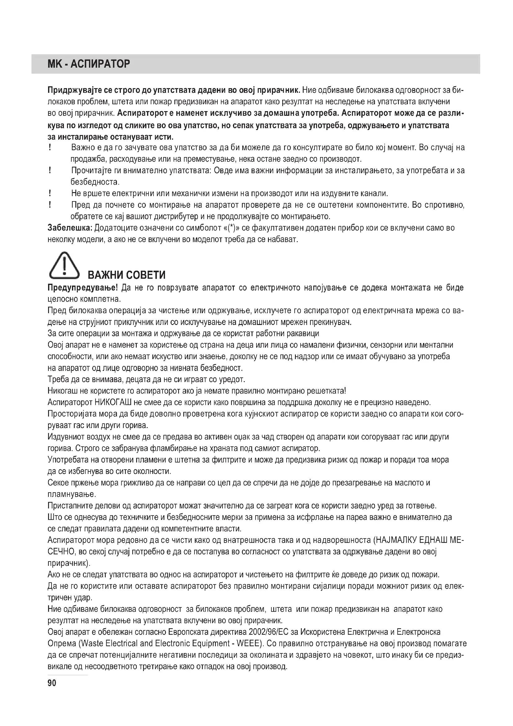MK - АСПИРАТОР Придржувајте се строго до упатствата дадени во овој прирачник. Ние одбиваме билокаква одговорност за би- локаков проблем, штета или пожар предизвикан на апаратот како резултат на неследење на упатствата вклучени во овој прирачник. Аспираторот е наменет исклучиво за домашна употреба. Аспираторот може да се разли- кува по изгледот од сликите во ова упатство, но сепак упатствата за употреба, одржувањето и упатствата за инсталирање остануваат исти. ! Важно е да го зачувате ова упатство за да би можеле да го консултирате во било кој момент. Во случај на продажба, расходување или на преместување, нека остане заедно со производот. ! Прочитајте ги внимателно упатствата: Овде има важни информации за инсталирањето, за употребата и за безбедноста. ! Не вршете електрични или механички измени на производот или на издувните канали. ! Пред да почнете со монтирање на апаратот проверете да не се оштетени компонентите. Во спротивно, обратете се кај вашиот дистрибутер и не продолжувајте со монтирањето. Забелешка: Додатоците означени со симболот «(*)» се факултативен додатен прибор кои се вклучени само во неколку модели, а ако не се вклучени во моделот треба да се набават. ВАЖНИ СОВЕТИ Предупредување! Да не го поврзувате апаратот со електричното напојување се додека монтажата не биде целосно комплетна. Пред билокаква операција за чистење или одржување, исклучете го аспираторот од електричната мрежа со ва- дење на струјниот приклучник или со исклучување на домашниот мрежен прекинувач. За сите операции за монтажа и одржување да се користат работни ракавици Овој апарат не е наменет за користење од страна на деца или лица со намалени физички, сензорни или ментални способности, или ако немаат искуство или знаење, доколку не се под надзор или се имаат обучувано за употреба на апаратот од лице одговорно за нивната безбедност. Треба да се внимава, децата да не си играат со уредот. Никогаш не користете го аспираторот ако ја немате правилно монтирано решетката! Аспираторот НИКОГАШ не смее да се користи како површина за поддршка доколку не е прецизно наведено. Просторијата мора да биде доволно проветрена кога кујнскиот аспиратор се користи заедно со апарати кои сого- руваат гас или други горива. Издувниот воздух не смее да се предава во активен оџак за чад створен од апарати кои согоруваат гас или други горива. Строго се забранува фламбирање на храната под самиот аспиратор. Употребата на отворени пламени е штетна за филтрите и може да предизвика ризик од пожар и поради тоа мора да се избегнува во сите околности. Секое пржење мора грижливо да се направи со цел да се спречи да не дојде до презагревање на маслото и пламнување. Пристапните делови од аспираторот можат значително да се загреат кога се користи заедно уред за готвење. Што се однесува до техничките и безбедносните мерки за примена за исфрлање на пареа важно е внимателно да се следат правилата дадени од компетентните власти. Аспираторот мора редовно да се чисти како од внатрешноста така и од надворешноста (НАЈМАЛКУ ЕДНАШ МЕ- СЕЧНО, во секој случај потребно е да се постапува во согласност со упатствата за одржување дадени во овој прирачник). Ако не се следат упатствата во однос на аспираторот и чистењето на филтрите ќе доведе до ризик од пожари. Да не го користите или оставате аспираторот б