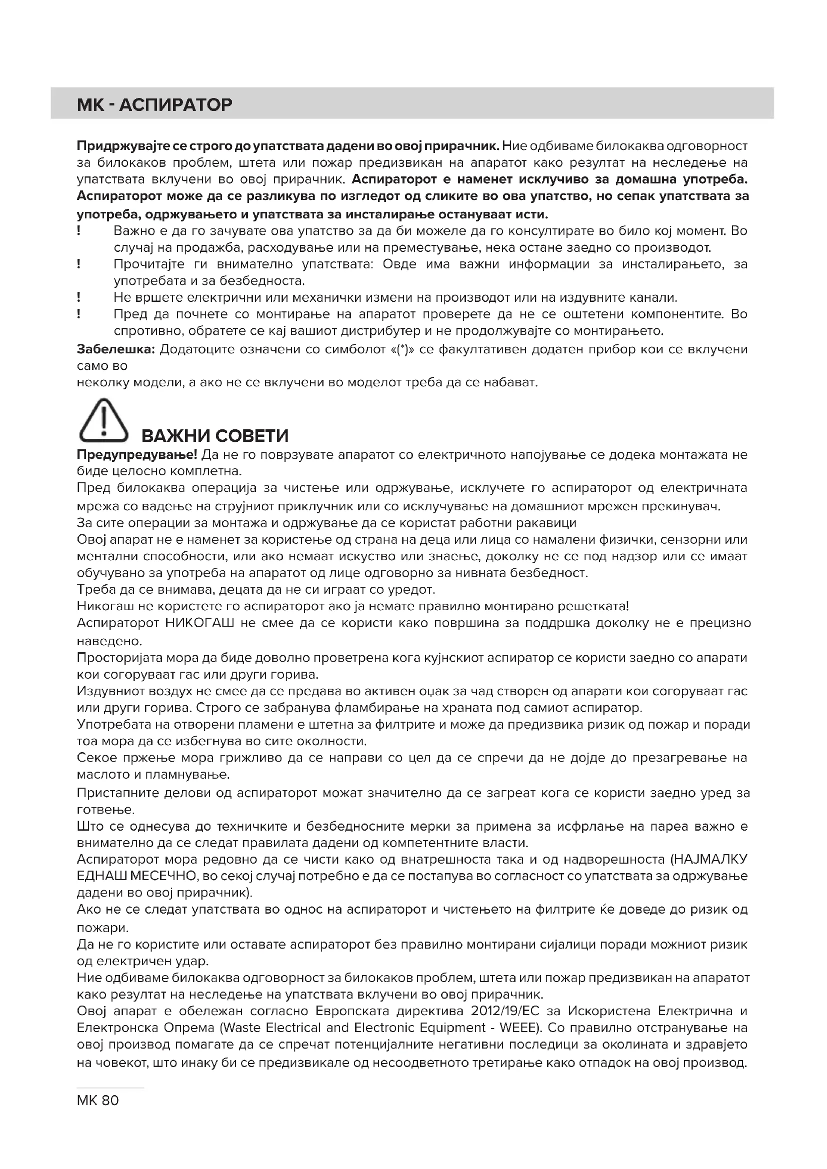 Да не го користите или оставате аспираторот без правилно монтирани сијалици поради можниот ризик од електричен удар. Ние одбиваме билокаква одговорност за билокаков проблем, штета или пожар предизвикан на апаратот како резултат на неследење на упатствата вклучени во овој прирачник. Овој апарат е обележан согласно Европската директива 2012/19/EC за Искористена Електрична и Електронска Опрема (Waste Electrical and Electronic Equipment - WEEE). Со правилно отстранување на овој производ помагате да се спречат потенцијалните негативни последици за околината и здравјето на човекот, што инаку би се предизвикале од несоодветното третирање како отпадок на овој производ.MK81 Симболот прецртана канта за ѓубре на производот или на документите кои одат со производот, покажува дека тој апарат не смее да се третира како комунален отпад. Напротив би требало да се однесе до соодветното место за собирање за рециклирање на електрична и електронска опрема. Отстранувањето мора да се изврши во согласност со локалните прописи за животната средина за отстранување на отпаден материјал. За повеќе детаљни информации за третманот, поправањето и рециклирањето на овој производ Ве молиме контактирајте со Вашите локални власти, Вашата комунална служба или со продавницата од каде го имате купено производот. Апаратот е дизајниран, тестиран и произведен според: