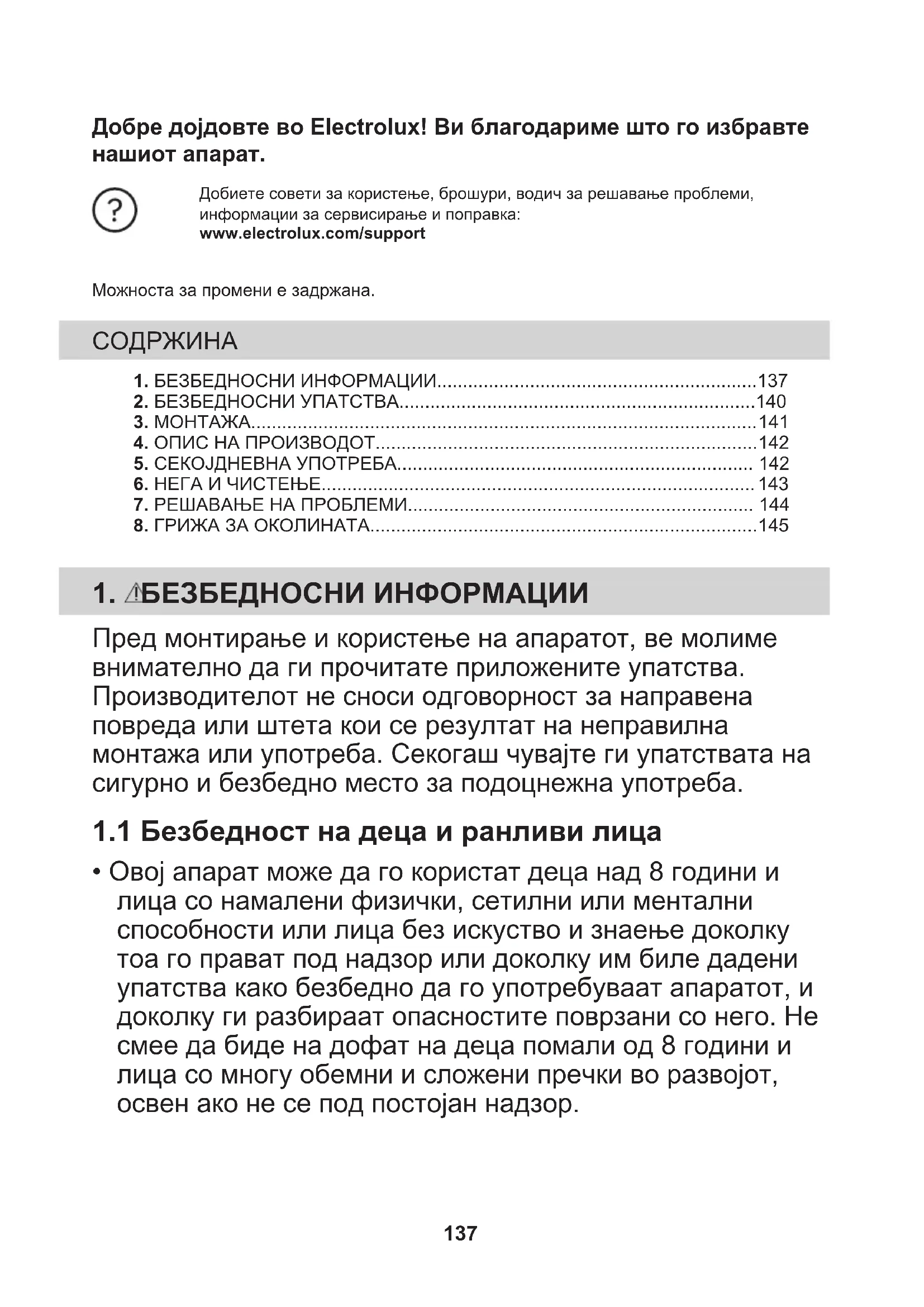 - Овој апарат може да го користат деца над 8 години и лица со намалени физички, сетилни или ментални способности или лица без искуство и знаење доколку тоа го прават под надзор или доколку им биле дадени упатства како безбедно да го употребуваат апаратот, и доколку ги разбираат опасностите поврзани со него. Не смее да биде на дофат на деца помали од 8 години и лица со многу обемни и сложени пречки во развојот, освен ако не се под постојан надзор. 137• Децата треба да бидат под надзор да не играат со