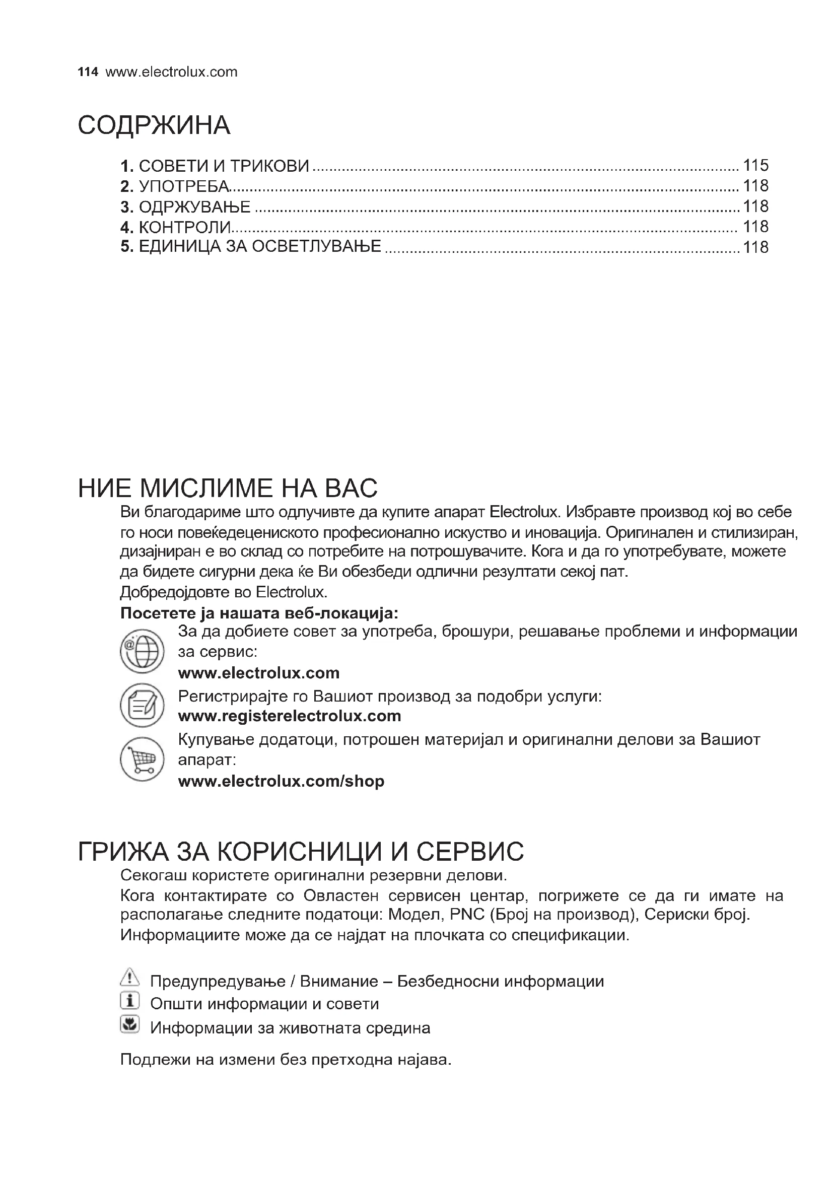 www.electrolux.com/shop ГРИЖА ЗА КОРИСНИЦИ И СЕРВИС Секогаш користете оригинални резервни делови. Кога контактирате со Овластен сервисен центар, погрижете се да ги имате на располагање следните податоци: Модел, PNC (Број на производ), Сериски број. Информациите може да се најдат на плочката со спецификации. Предупредување / Внимание – Безбедносни информации Општи информации и совети Информации за животната средина Подлежи на измени без претходна најава.115 MACEDONIAN