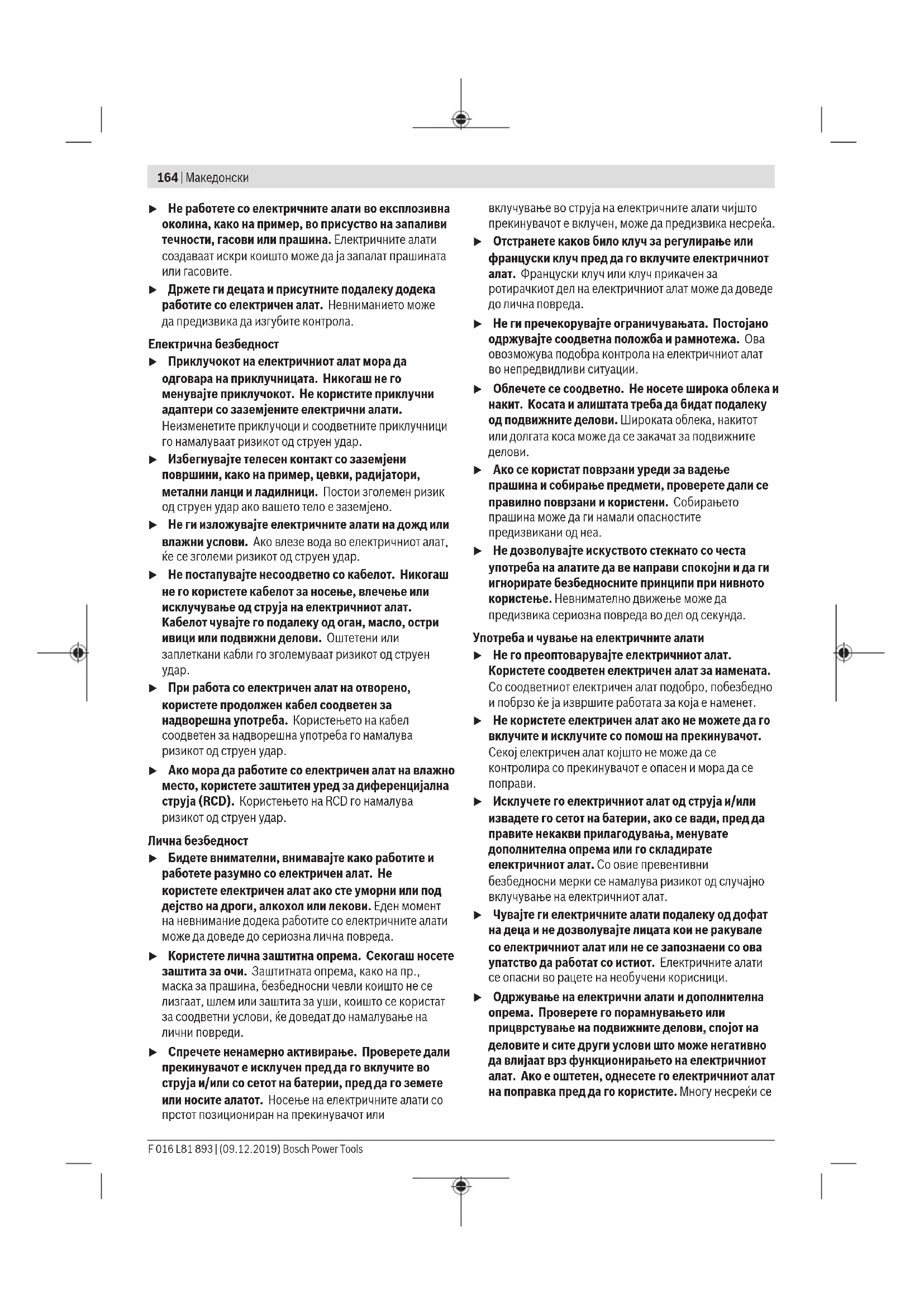 Прочитајте ги сите безбедносни предупредувања, илустрации и спецификации приложени со овој електричен алат. Непридржувањето до сите упатства приложени подолу може да доведе до струен удар, пожар и/или тешки повреди. Зачувајте ги безбедносните предупредувања и упатства за користење и за во иднина. Поимот „електричен алат“ во безбедносните предупредувања се однесува на електрични апарати што користат струја (кабелски) или апарати што користат батерии (акумулаторски). Безбедност на работниот простор u Работниот простор одржувајте го чист и добро осветлен. Преполни или темни простории може да доведат до несреќа. Bosch Power Tools F 016 L81 893 | (09.12.2019)164 | Македонски u Не работете со електричните алати во експлозивна околина, како на пример, во присуство на запаливи течности, гасови или прашина. Електричните алати создаваат искри коишто може да ја запалат прашината или гасовите. u Држете ги децата и присутните подалеку додека работите со електричен алат. Невниманието може да предизвика да изгубите контрола. Електрична безбедност u Приклучокот на електричниот алат мора да одговара на приклучницата. Никогаш не го менувајте приклучокот. Не користите приклучни адаптери со заземјените електрични алати. Неизменетите приклучоци и соодветните приклучници го намалуваат ризикот од струен удар. u Избегнувајте телесен контакт со заземјени површини, како на пример, цевки, радијатори, метални ланци и ладилници. Постои зголемен ризик од струен удар ако вашето тело е заземјено. u Не ги изложувајте електричните алати на дожд или влажни услови. Ако влезе вода во електричниот алат, ќе се зголеми ризикот од струен удар. u Не постапувајте несоодветно со кабелот. Никогаш не го користете кабелот за носење, влечење или исклучување од струја на електричниот алат. Кабелот чувајте го подалеку од оган, масло, остри ивици или подвижни делови. Оштетени или заплеткани кабли го зголемуваат ризикот од струен