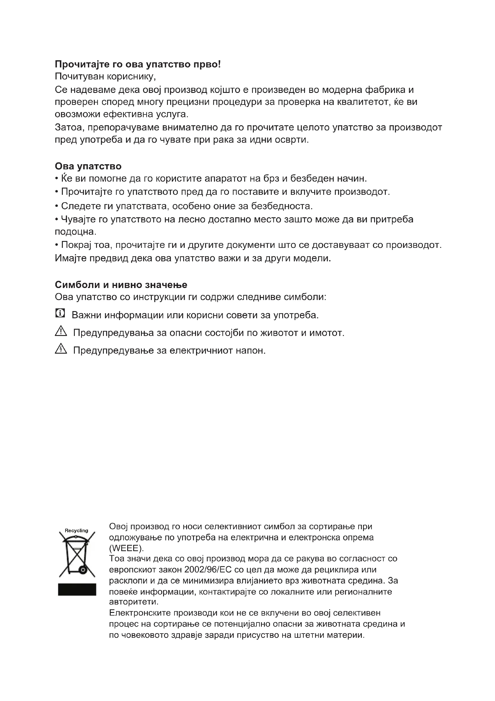 - Покрај тоа, прочитајте ги и другите документи што се доставуваат со производот. Имајте предвид дека ова упатство важи и за други модели. Симболи и нивно значење Ова упатство со инструкции ги содржи следниве симболи: C Важни информации или корисни совети за употреба. A Предупредувања за опасни состојби по животот и имотот. B Предупредување за електричниот напон. Recycling Овој производ го носи селективниот симбол за сортирање при одложување по употреба на електрична и електронска опрема (WEEE). Тоа значи дека со овој производ мора да се ракува во согласност со европскиот закон 2002/96/ЕС со цел да може да рециклира или расклопи и да се минимизира влијанието врз животната средина. За повеќе информации, контактирајте со локалните или регионалните авторитети. Електронските производи кои не се вклучени во овој селективен процес на сортирање се потенцијално опасни за животната средина и по човековото здравје заради присуство на штетни материи.МК