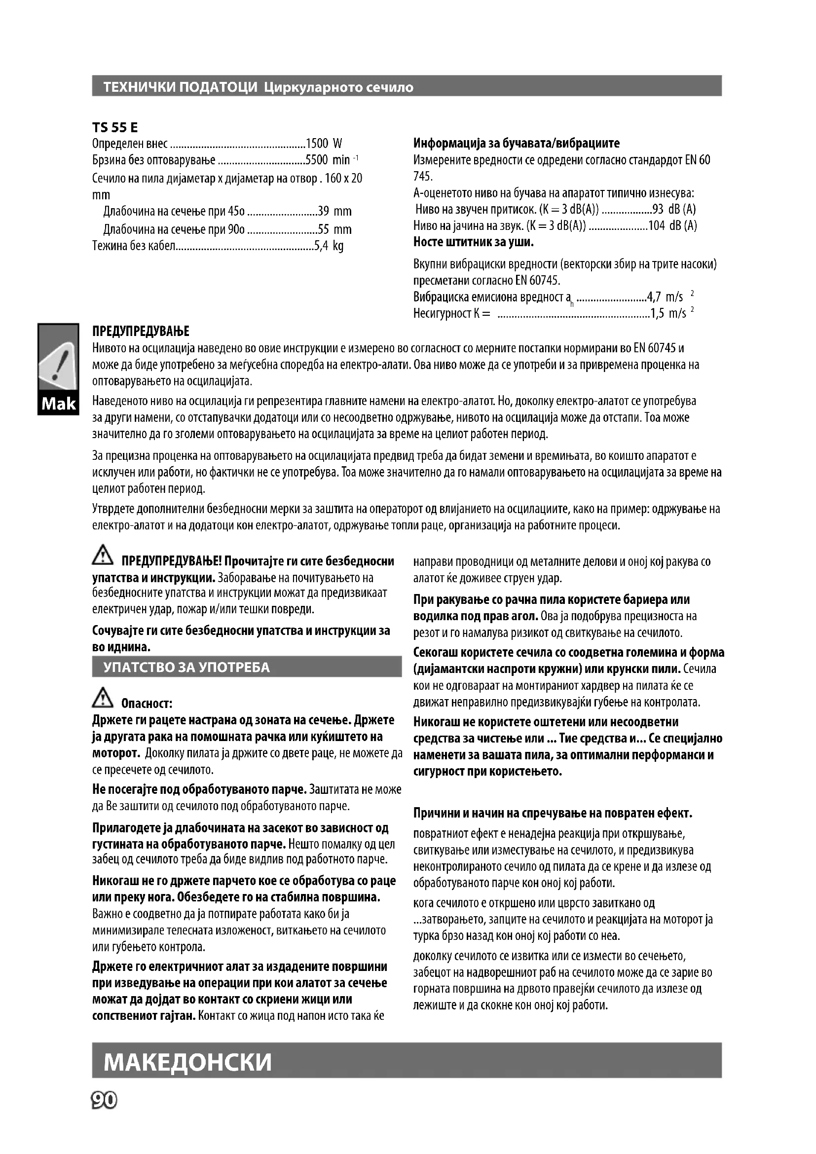 Ве молиме пред да ја стартувате машината обрнете внимание на упатствата за употреба. ВНИМАНИЕ! ПРЕДУПРЕДУВАЊЕ! ОПАСНОСТ! Пршината која се создава при користење на овој алат може да биде штетна по здравјето. Не ја вдишувајте. Носете соодветна заштитна маска. Секогаш при користење на машината носете
