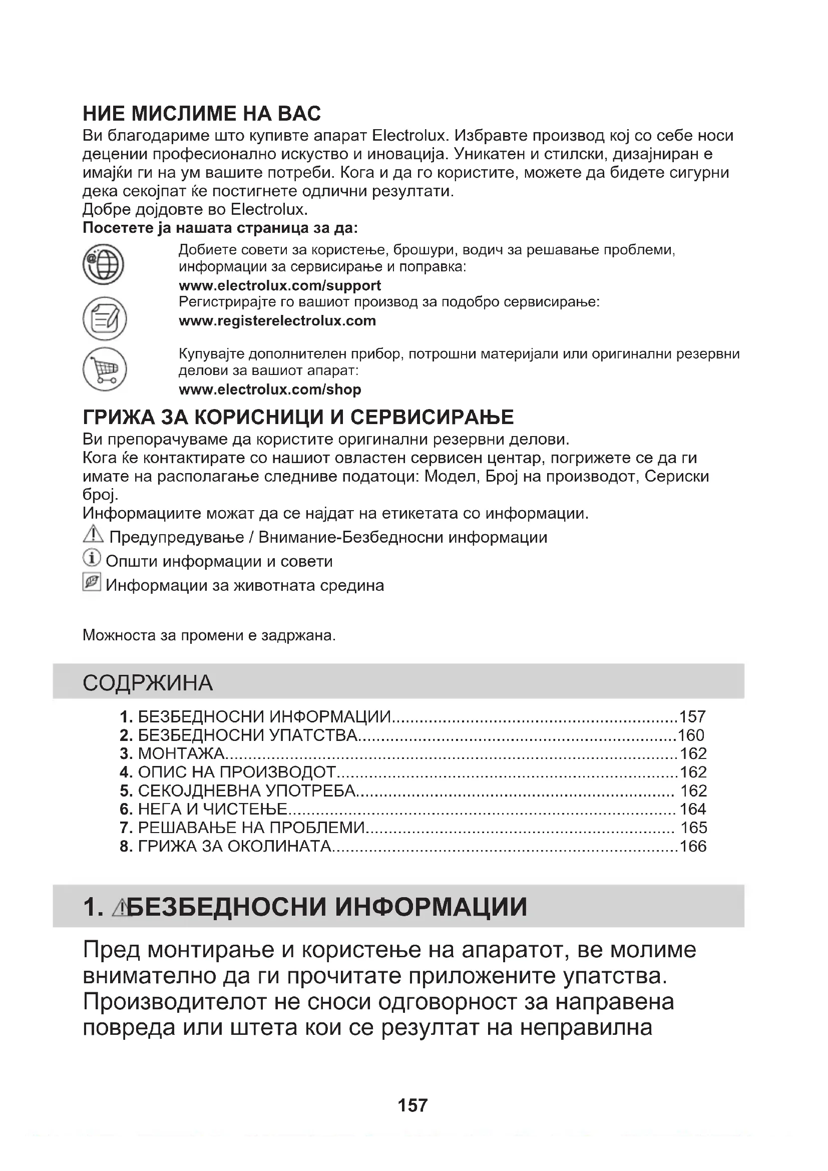 Пред монтирање и користење на апаратот, ве молиме внимателно да ги прочитате приложените упатства. Производителот не сноси одговорност за направена повреда или штета кои се резултат на неправилна 157монтажа или употреба. Секогаш чувајте ги упатствата на сигурно и безбедно место за подоцнежна употреба.