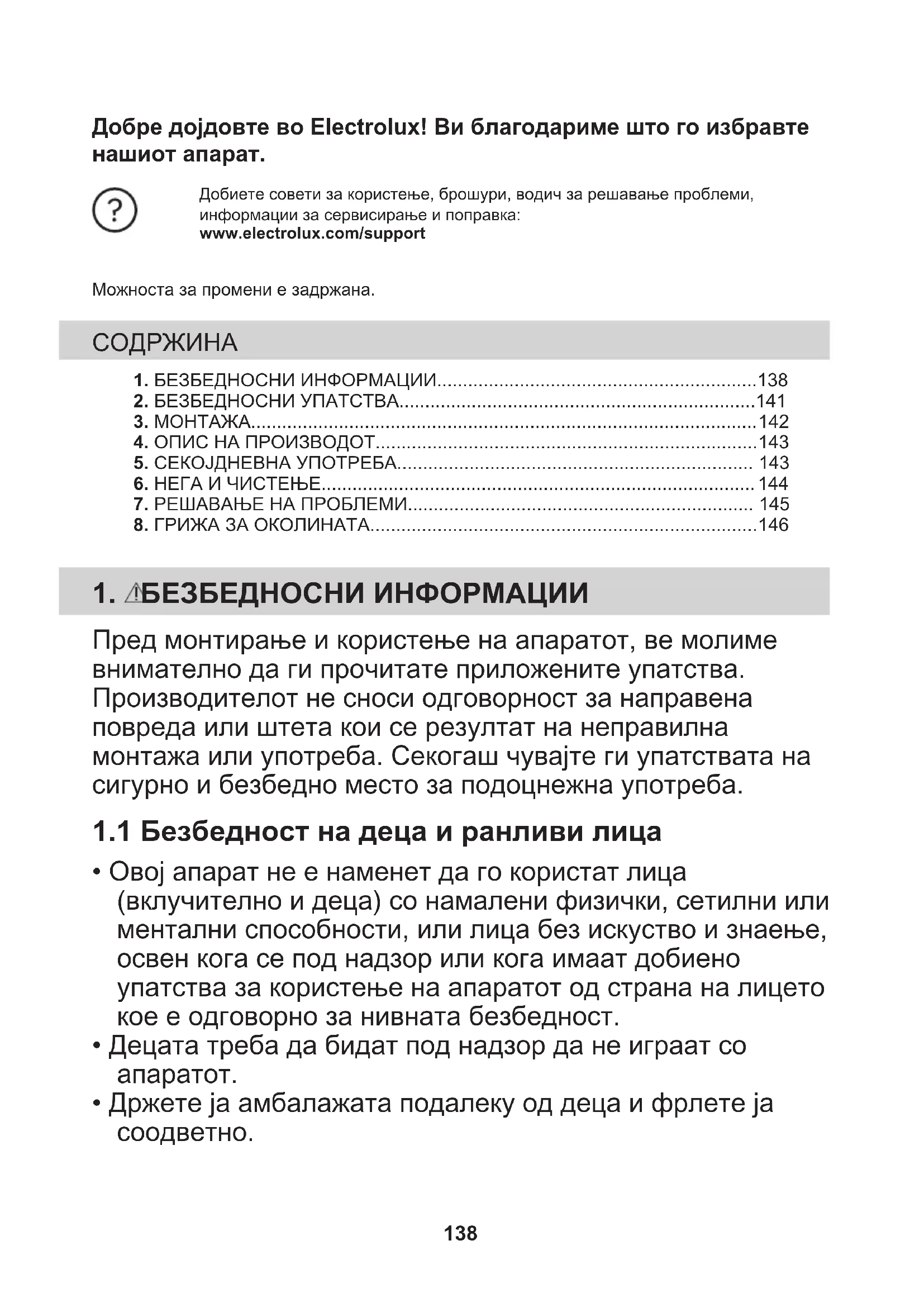 Рециклирајте ги материјалите со симболот . Ставете ја амбалажата во соодветни контејнери за да ја рециклирате. Помогнете во заштитата на живтната средина и човековото здравје и рециклирајте го отпадот од електрични и електронски апарати. Не фрлајте ги апаратите озанчени со симболот во отпадот од домаќинството. Вратете го производот во вашиот локален капацитет за рециклирање или контактирајте ја вашата општинска канцеларија. 146Welkom bij Electrolux! Hartelijk dank dat je voor onze apparatuur hebt gekozen. Advies over gebruik, brochures, het oplossen van problemen, service- en reparatie-informatie:www.electrolux.com/supportWijzigingen voorbehouden. INHOUDSOPGAVE