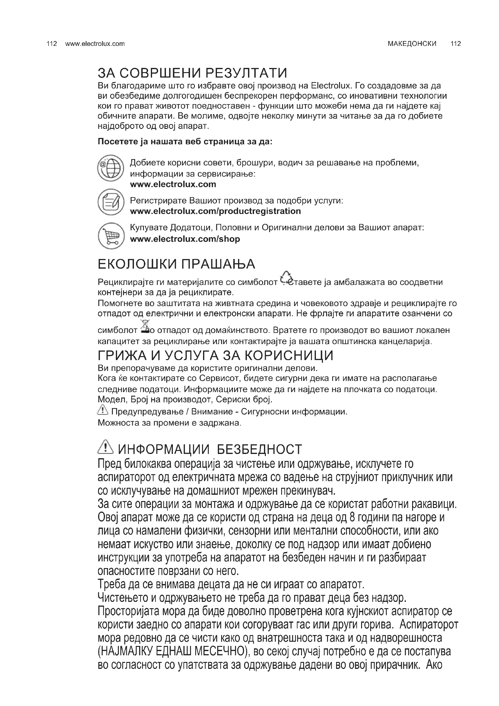ЗА СОВРШЕНИ РЕЗУЛТАТИ Ви благодариме што го избравте овој производ на Electrolux. Го создадовме за да ви обезбедиме долгогодишен беспрекорен перформанс, со иновативни технологии кои го прават животот поедноставен - функции што можеби нема да ги најдете кај обичните апарати. Ве молиме, одвојте неколку минути за читање за да го добиете најдоброто од овој апарат. Посетете ја нашата веб страница за да: Добиете корисни совети, брошури, водич за решавање на проблеми, информации за сервисирање: www.electrolux.com Регистрирате Вашиот производ за подобри услуги: www.electrolux.com/productregistration Купувате Додатоци, Половни и Оригинални делови за Вашиот апарат: www.electrolux.com/shop ЕКОЛОШКИ ПРАШАЊА Рециклирајте ги материјалите со симболот . Ставете ја амбалажата во соодветни контејнери за да ја рециклирате. Помогнете во заштитата на живтната средина и човековото здравје и рециклирајте го отпадот од електрични и електронски апарати. Не фрлајте ги апаратите озанчени со симболот во отпадот од домаќинството. Вратете го производот во вашиот локален капацитет за рециклирање или контактирајте ја вашата општинска канцеларија. ГРИЖА И УСЛУГА ЗА КОРИСНИЦИ Ви препорачуваме да користите оригинални делови. Кога ќе контактирате со Сервисот, бидете сигурни дека ги имате на располагање следниве податоци. Информациите може да ги најдете на плочката со податоци. Модел, Број на производот, Сериски број. Предупредување / Внимание - Сигурносни информации. Можноста за промени е задржана. ИНФОРМАЦИИ БЕЗБЕДНОСТ Пред билокаква операција за чистење или одржување, исклучете го аспираторот од електричната мрежа со вадење на струјниот приклучник или со исклучување на домашниот мрежен прекинувач. За сите операции за монтажа и одржување да се користат работни ракавици. Овој апарат може да се користи од страна на деца од 8 години па нагоре и лица со намалени физички, сензорни или ментални способности, или ако немаат искуство или знаење, доколку се под надзор или имаат добиено инструкции за употреба на апаратот на безбеден начин и ги разбираат опасностите поврзани со него. Треба да се внимава децата да не си играат со апаратот. Чистењето и одржувањето не треба да го прават деца без надзор. Просторијата мора да биде доволно проветрена кога кујнскиот аспиратор се користи заедно со апарати кои согоруваат гас или други горива. Аспираторот мора редовно да се чисти како од внатрешноста така и од надворешноста (НАЈМАЛКУ ЕДНАШ МЕСЕЧНО), во секој случај потребно е да се постапува во согласност со упатствата за одржување дадени во овој прирачник. Ако MK УПАТСТВО ЗА КОРИСНИК113МАКЕДОНСКИ не се следат упатствата во однос на аспираторот и чистењето на филтрите ќе доведе до ризик од пожари. Строго се забранува фламбирање на храната под самиот аспиратор. Употребата на отворени пламени е штетна за филтрите и може да предизвика ризик од пожар и поради тоа мора да се избегнува во сите околности. Секое пржење мора грижливо да се направи со цел да се спречи да не дојде до презагревање на маслото и пламнување. ВНИМАНИЕ: Кога плочата за готвење е во функција пристапните делови од аспираторот можат да се загреат. За замена на сијалицата користете само од типот на сијалица наведен во делот одржување/замена на сијалицата во овој прирачник. Внимание! Да не го поврзувате апаратот со електричното напојување сè додека монтажа