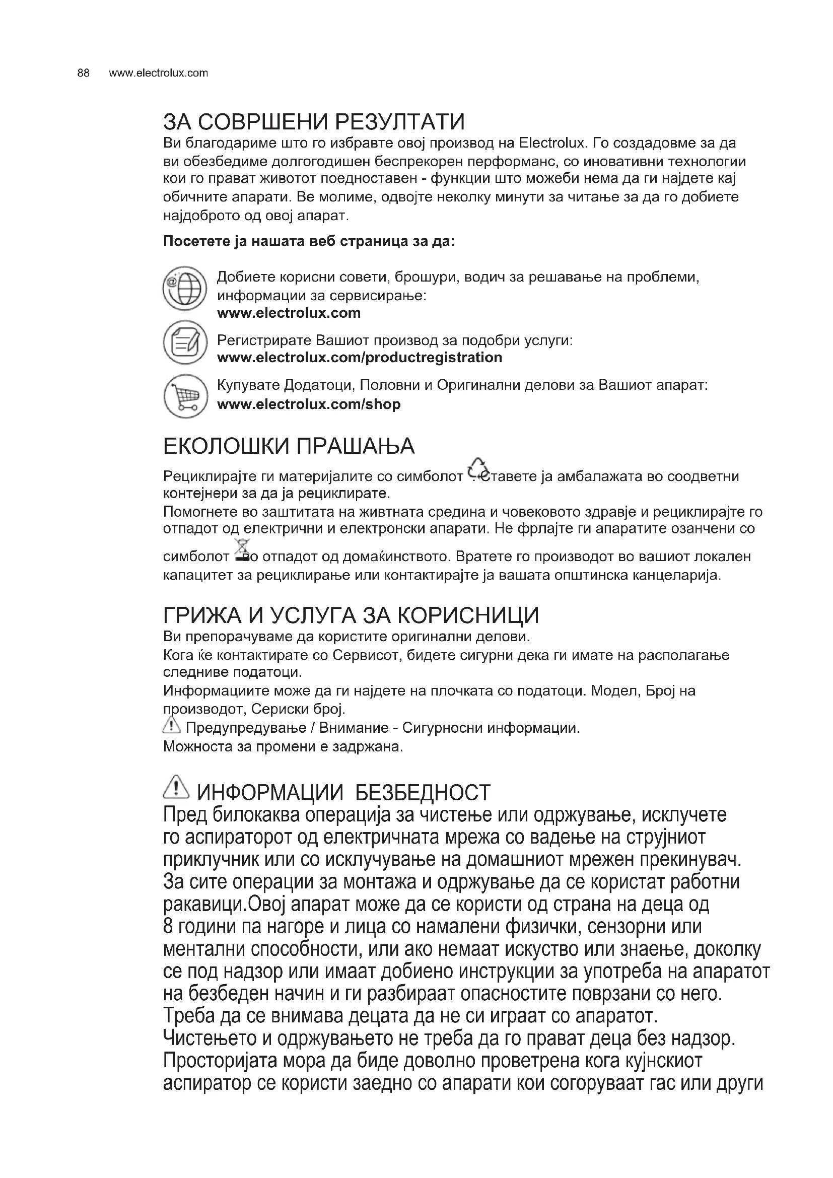 ЗА СОВРШЕНИ РЕЗУЛТАТИ Ви благодариме што го избравте овој производ на Electrolux. Го создадовме за да ви обезбедиме долгогодишен беспрекорен перформанс, со иновативни технологии кои го прават животот поедноставен - функции што можеби нема да ги најдете кај обичните апарати. Ве молиме, одвојте неколку минути за читање за да го добиете најдоброто од овој апарат. Посетете ја нашата веб страница за да: Добиете корисни совети, брошури, водич за решавање на проблеми, информации за сервисирање: www.electrolux.com Регистрирате Вашиот производ за подобри услуги: www.electrolux.com/productregistration Купувате Додатоци, Половни и Оригинални делови за Вашиот апарат: www.electrolux.com/shop ЕКОЛОШКИ ПРАШАЊА Рециклирајте ги материјалите со симболот . Ставете ја амбалажата во соодветни контејнери за да ја рециклирате. Помогнете во заштитата на живтната средина и човековото здравје и рециклирајте го отпадот од електрични и електронски апарати. Не фрлајте ги апаратите озанчени со симболот во отпадот од домаќинството. Вратете го производот во вашиот локален капацитет за рециклирање или контактирајте ја вашата општинска канцеларија. ГРИЖА И УСЛУГА ЗА КОРИСНИЦИ Ви препорачуваме да користите оригинални делови. Кога ќе контактирате со Сервисот, бидете сигурни дека ги имате на располагање следниве податоци. Информациите може да ги најдете на плочката со податоци. Модел, Број на производот, Сериски број. Предупредување / Внимание - Сигурносни информации. Можноста за промени е задржана. ИНФОРМАЦИИ БЕЗБЕДНОСТ Пред билокаква операција за чистење или одржување, исклучете го аспираторот од електричната мрежа со вадење на струјниот приклучник или со исклучување на домашниот мрежен прекинувач. За сите операции за монтажа и одржување да се користат работни ракавици.Овој апарат може да се користи од страна на деца од 8 години па нагоре и лица со намалени физички, сензорни или ментални способности, или ако немаат искуство или знаење, доколку се под надзор или имаат добиено инструкции за употреба на апаратот на безбеден начин и ги разбираат опасностите поврзани со него. Треба да се внимава децата да не си играат со апаратот. Чистењето и одржувањето не треба да го прават деца без надзор. Просторијата мора да биде доволно проветрена кога кујнскиот аспиратор се користи заедно со апарати кои согоруваат гас или други MK УПАТСТВО ЗА КОРИСНИК89