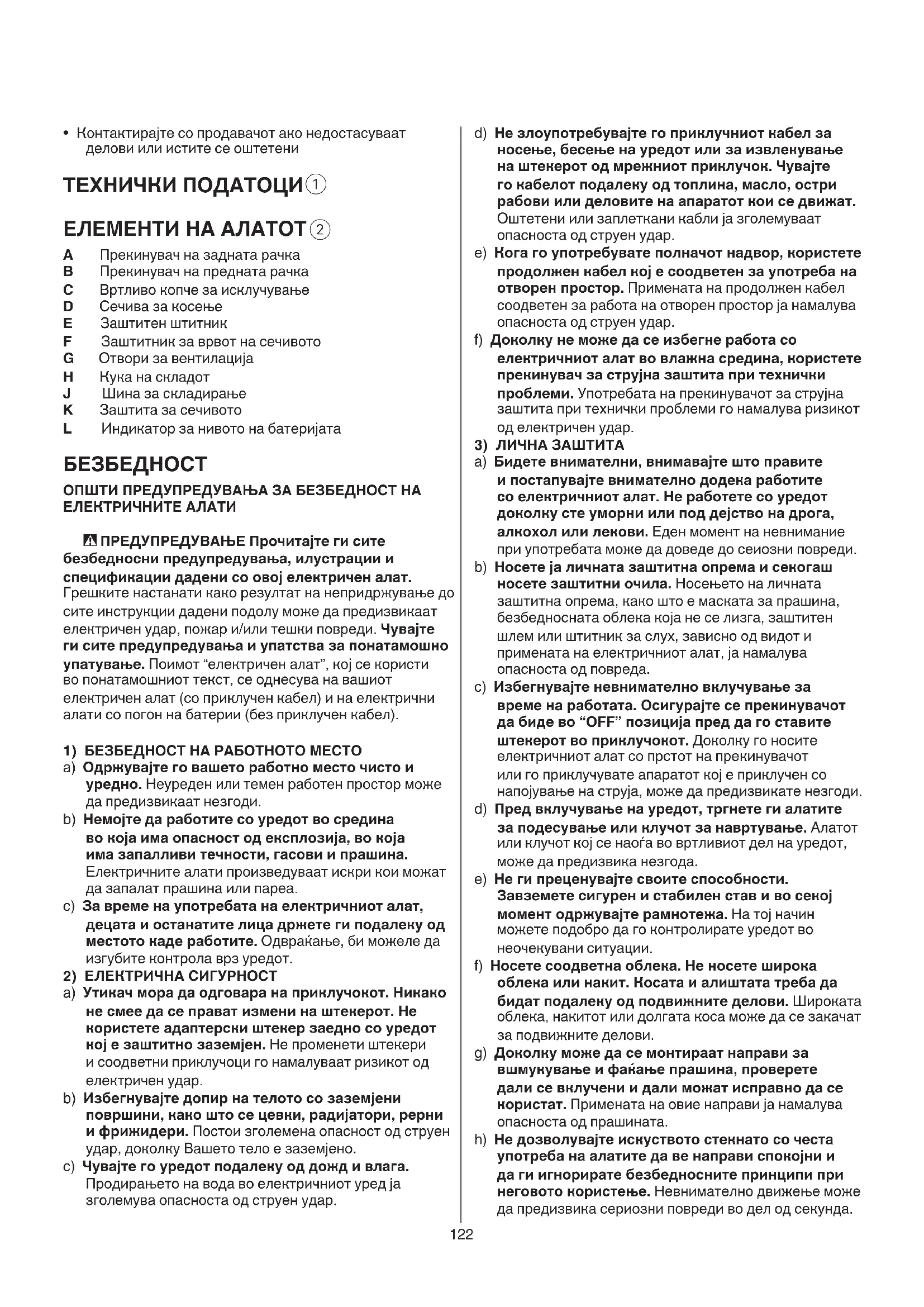 СПЕЦИФИЧНИ БЕЗБЕДНОСНИ УПАТСТВА ЗА ПОТКАСТРУВАЧИТЕ НА ЖИВА ОГРАДА a) Делови од телото не смеат да дојдат близу сечилото. Не отстранувајте поткастрен материјал и не држете материјал што треба да се поткаструва додека се движат сечилата. Сечилата продолжуваат да се движат и по исклучување на алатот. Момент на невнимание при работење со поткаструвач на жива ограда може да доведе до сериозна повреда. b) Поткаструвачот на жива ограда треба да се носи за рачката, со запрени сечила, и внимавајте да не притиснете некој прекинувач. Со правилно носење на поткаструвачот на жива ограда ќе се намали ризикот од случајно вклучување на алатот, а со тоа и повреда од сечилата. c) При транспорт или складирање на поткаструвачот на жива ограда, секогаш ставајте ја навлаката за сечила. Со соодветно ракување со поткаструвачот на жива ограда се намалува ризикот за лична повреда од сечилата. d) При чистење заглавен материјал или при сервисирање на уредот, уверете се дека се исклучени сите прекинувачи и дека е отстранета или исклучена батеријата. Неочекуваното вклучување на поткаструвачот на жива ограда при чистење заглавен материјал или при сервисирање може да предизвика сериозни повреди.