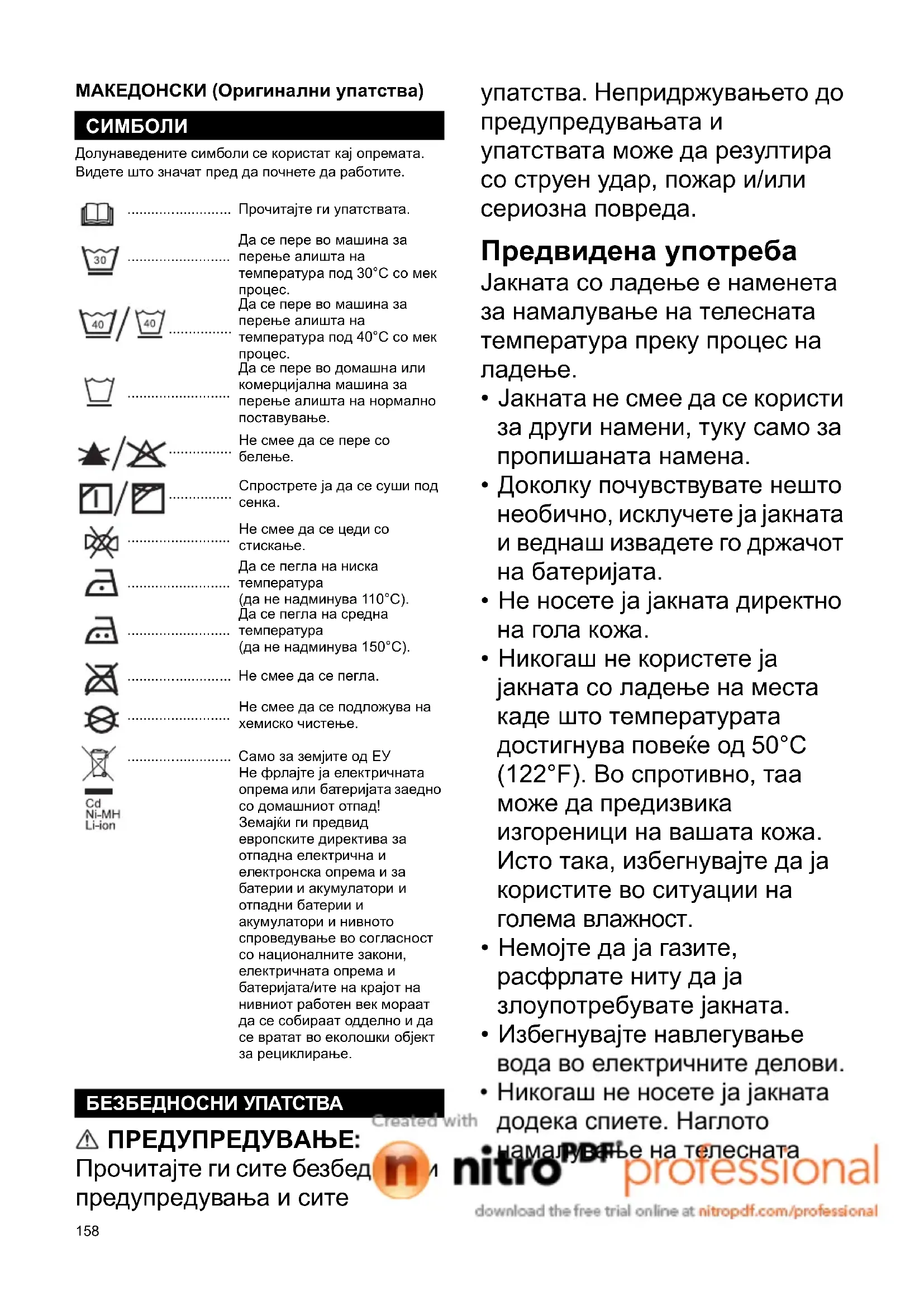 - Исклучиво користете ја јакната со конкретно наменета батерија. Користењето други батерии може да создаде ризик од повреда или пожар.