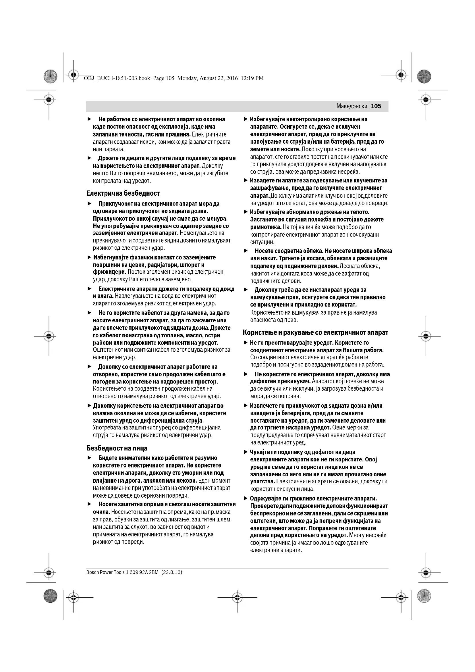 е прав, осигурете се дека тие правилно се приклучени и прикладно се користат. Користењето на вшмукувач за прав не ја намалува опасноста од прав. Користење и ракување со електричниот апарат Не го преоптоварувајте уредот. Користете го соодветниот електричен апарат за Вашата работа. Со соодветниот електричен апарат ќе работите подобро и посигурно во зададениот домен на работа. Не користете го електричниот апарат, доколку има дефектен прекинувач. Апаратот кој повеќе не може да се вклучи или исклучи, ја загрозува безбедноста и мора да се поправи. Извлечете го приклучокот од ѕидната дозна и/или извадете ја батеријата, пред да ги смените поставките на уредот, да ги замените деловите или да го тргнете настрана уредот. Овие мерки за предупредување го спречуваат невнимателниот старт на електричниот уред. Чувајте ги подалеку од дофатот на деца електричните апарати кои не ги користите. Овој уред не смее да го користат лица кои не се запознаени со него или не ги имаат прочитано овие упатства. Електричните апарати се опасни, доколку ги користат неискусни лица. Одржувајте ги грижливо електричните апарати. Проверете дали подвижните делови функционираат беспрекорно и не се заглавени, дали се скршени или оштетени, што може да ја попречи функцијата на електричниот апарат. Поправете ги оштетените делови пред користењето на уредот. Многу несреќи својата причина ја имаат во лошо одржуваните електрични апарати. OBJ_BUCH-1851-003.book Page 105 Monday, August 22, 2016 12:19 PM106 | Македонски 1 609 92A 2BM | (22.8.16) Bosch Power Tools Алатот за сечење одржувајте го остар и чист. Внимателно одржуваните алати за сечење со остри рабови за сечење помалку се заглавуваат и со нив полесно се работи. Користете ги електричните апарати, опремата, додатоците за алатите итн. во согласност со ова упатство. Притоа земете ги во обѕир работните услови и дејноста што треба да се изврши. Користењето на електрични апарати за друга употреба освен наведената може да доведе до опасни ситуации.