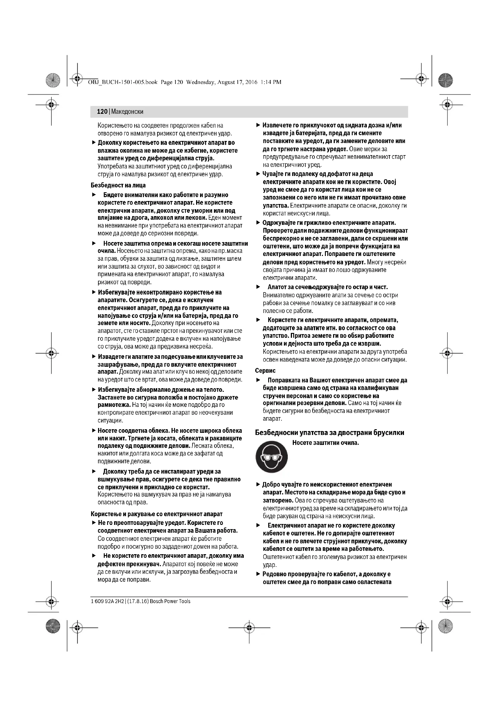 OBJ_BUCH-1501-005.book Page 119 Wednesday, August 17, 2016 1:14 PM120 | Македонски 1 609 92A 2H2 | (17.8.16) Bosch Power Tools Користењето на соодветен продолжен кабел на отворено го намалува ризикот од електричен удар. Доколку користењето на електричниот апарат во влажна околина не може да се избегне, користете заштитен уред со диференцијална струја. Употребата на заштитниот уред со диференцијална струја го намалува ризикот од електричен удар. Безбедност на лица Бидете внимателни како работите и разумно користете го електричниот апарат. Не користете електрични апарати, доколку сте уморни или под влијание на дрога, алкохол или лекови. Еден момент на невнимание при употребата на електричниот апарат може да доведе до сериозни повреди. Носете заштитна опрема и секогаш носете заштитни очила. Носењето на заштитна опрема, како на пр.маска за прав, обувки за заштита од лизгање, заштитен шлем или заштита за слухот, во зависност од видот и примената на електричниот апарат, го намалува ризикот од повреди. Избегнувајте неконтролирано користење на апаратите. Осигурете се, дека е исклучен електричниот апарат, пред да го приклучите на напојување со струја и/или на батерија, пред да го земете или носите. Доколку при носењето на апаратот, сте го ставиле прстот на прекинувачот или сте го приклучиле уредот додека е вклучен на напојување со струја, ова може да предизвика несреќа. Извадете ги алатите за подесување или клучевите за зашрафување, пред да го вклучите електричниот апарат. Доколку има алат или клуч во некој од деловите на уредот што се вртат, ова може да доведе до повреди. Избегнувајте абнормално држење на телото. Застанете во сигурна положба и постојано држете рамнотежа. На тој начин ќе може подобро да го контролирате електричниот апарат во неочекувани