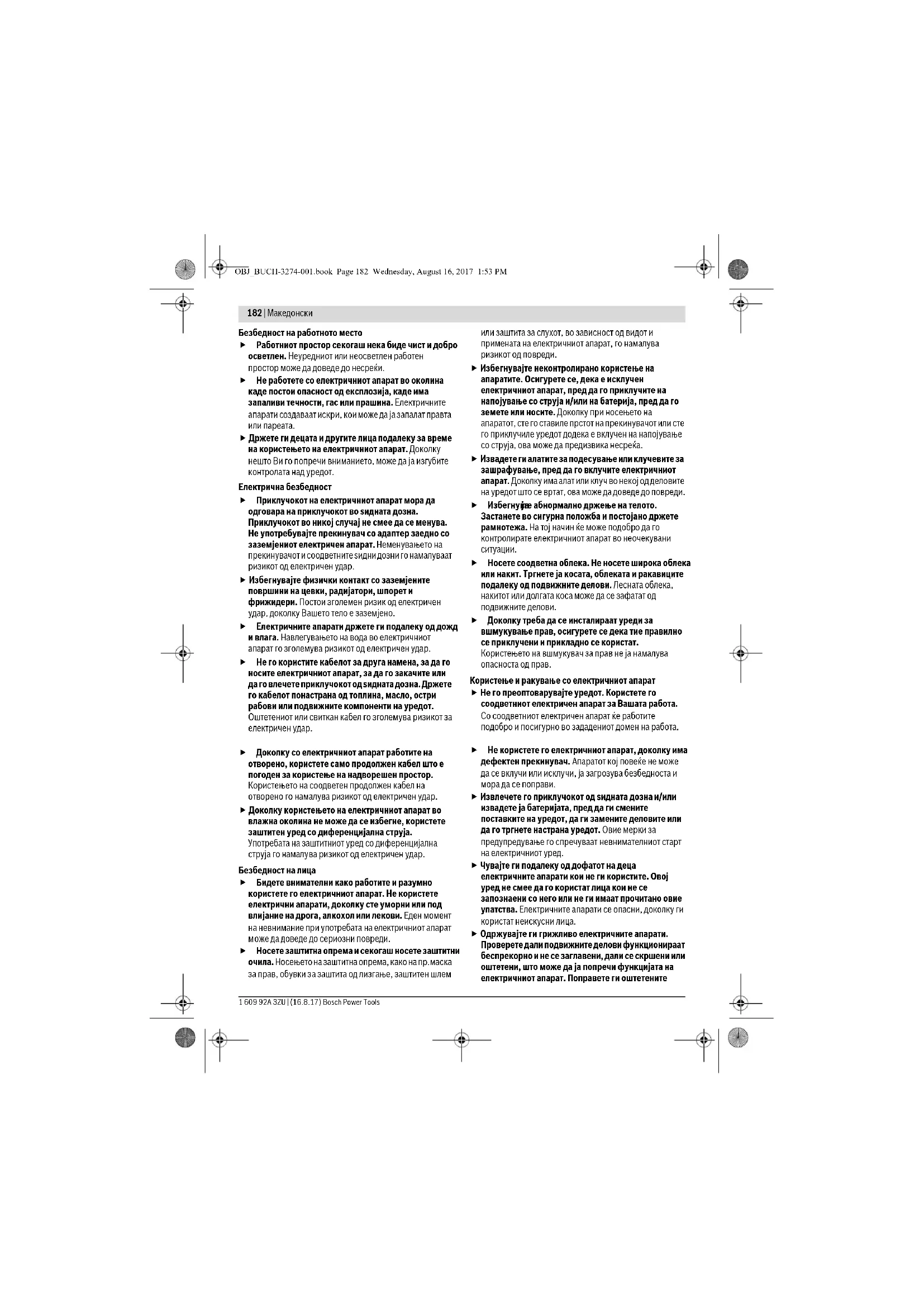 Безбедносни напомени Општи напомени за безбедност за електричните апарати Прочитајте ги сите напомени и упатства за безбедност. Грешките настанати како резултат од непридржување до безбедносните напомени и упатства може да предизвикаат електричен удар, пожар и/или тешки повреди. Зачувајте ги безбедносните напомени и упатства за користење и за во иднина. Поимот „електричен алат“ во напомените за безбедност се однесува на електрични апарати што користат струја (со струен кабел) и електрични апарати што користат батерии (без струен кабел). ПРЕДУПРЕДУВАЊЕ OBJ_BUCH-3274-001.book Page 181 Wednesday, August 16, 2017 1:53 PM182 | Македонски 1 609 92A 3ZU | (16.8.17) Bosch Power Tools Безбедност на работното место Работниот простор секогаш нека биде чист и добро осветлен. Неуредниот или неосветлен работен простор може да доведе до несреќи. Не работете со електричниот апарат во околина каде постои опасност од експлозија, каде има запаливи течности, гас или прашина. Електричните апарати создаваат искри, кои може да ја запалат правта или пареата. Држете ги децата и другите лица подалеку за време на користењето на електричниот апарат. Доколку нешто Ви го попречи вниманието, може да ја изгубите контролата над уредот. Електрична безбедност Приклучокот на електричниот апарат мора да одговара на приклучокот во ѕидната дозна. Приклучокот во никој случај не смее да се менува. Не употребувајте прекинувач со адаптер заедно со заземјениот електричен апарат. Неменувањето на прекинувачот и соодветните ѕидни дозни го намалуваат ризикот од електричен удар. Избегнувајте физички контакт со заземјените површини на цевки, радијатори, шпорет и фрижидери. Постои зголемен ризик од електричен удар, доколку Вашето тело е заземјено. Електричните апарати држете ги подалеку од дожд и влага. Навлегувањето на вода во електричниот апарат го зголемува ризикот од електричен удар. Не го користите кабелот за друга намена, за да го носите електричниот апарат, за да го закачите или да го влечете приклучокот од ѕидната дозна. Држете го кабелот понастрана од топлина, масло, остри рабови или подвижните компоненти на уредот. Оштетениот или свиткан кабел го зголемува ризикот за електричен удар. Доколку со електричниот апарат работите на отворено, користете само продолжен кабел што е погоден за користење на надворешен простор. Користењето на соодветен продолжен кабел на отворено го намалува ризикот од електричен удар. Доколку користењето на електричниот апарат во влажна околина не може да се избегне, користете заштитен уред со диференцијална струја. Употребата на заштитниот уред со диференцијална струја го намалува ризикот од електричен удар. Безбедност на лица Бидете внимателни како работите и разумно користете го електричниот апарат. Не користете електрични апарати, доколку сте уморни или под влијание на дрога, алкохол или лекови. Еден момент на невнимание при употребата на електричниот апарат