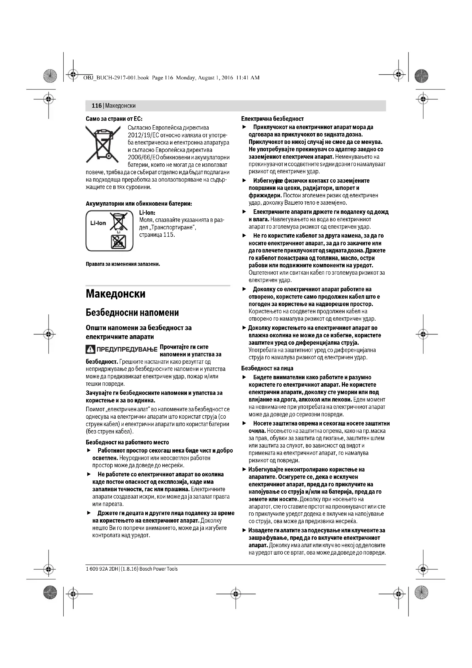 апаратите. Осигурете се, дека е исклучен електричниот апарат, пред да го приклучите на напојување со струја и/или на батерија, пред да го земете или носите. Доколку при носењето на апаратот, сте го ставиле прстот на прекинувачот или сте го приклучиле уредот додека е вклучен на напојување со струја, ова може да предизвика несреќа. Извадете ги алатите за подесување или клучевите за зашрафување, пред да го вклучите електричниот апарат. Доколку има алат или клуч во некој од деловите на уредот што се вртат, ова може да доведе до повреди. ПРЕДУПРЕДУВАЊЕ OBJ_BUCH-2917-001.book Page 116 Monday, August 1, 2016 11:41 AMМакедонски | 117 Bosch Power Tools 1 609 92A 2DH | (1.8.16) Избегнувајте абнормално држење на телото. Застанете во сигурна положба и постојано држете рамнотежа. На тој начин ќе може подобро да го контролирате електричниот апарат во неочекувани