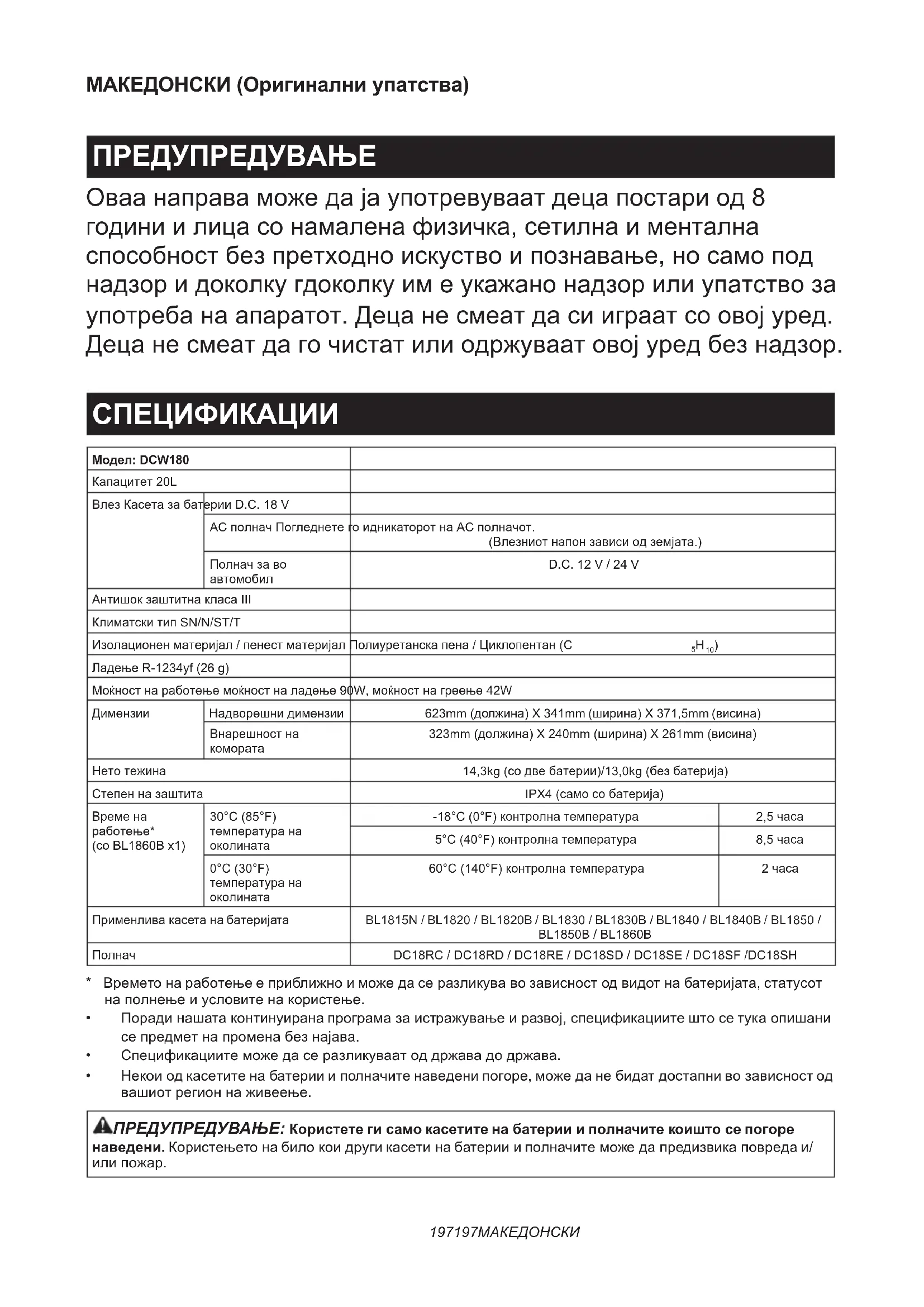 - Originalna baterija i punjač Makita OBAVIJEST: Neke stavke s popisa mogu biti uklju- čene u paket alata kao standardni dodaci. Mogu se razlikovati od zemlje do zemlje. HRVATSKI197197 МАКЕДОНСКИ МАКЕДОНСКИ (Оригинални упатства) ПРЕДУПРЕДУВАЊЕ Оваа направа може да ја употревуваат деца постари од 8 години и лица со намалена физичка, сетилна и ментална способност без претходно искуство и познавање, но само под надзор и доколку гдоколку им е укажано надзор или упатство за употреба на апаратот. Деца не смеат да си играат со овој уред. Деца не смеат да го чистат или одржуваат овој уред без надзор. СПЕЦИФИКАЦИИ Модел: DCW180Капацитет 20LВлез Касета за батерии D.C. 18 VAC полнач Погледнете го идникаторот на AC полначот.(Влезниот напон зависи од земјата.)Полнач за во автомобилD.C. 12 V / 24 VАнтишок заштитна класа IIIКлиматски тип SN/N/ST/TИзолационен материјал / пенест материјал Полиуретанска пена / Циклопентан (C