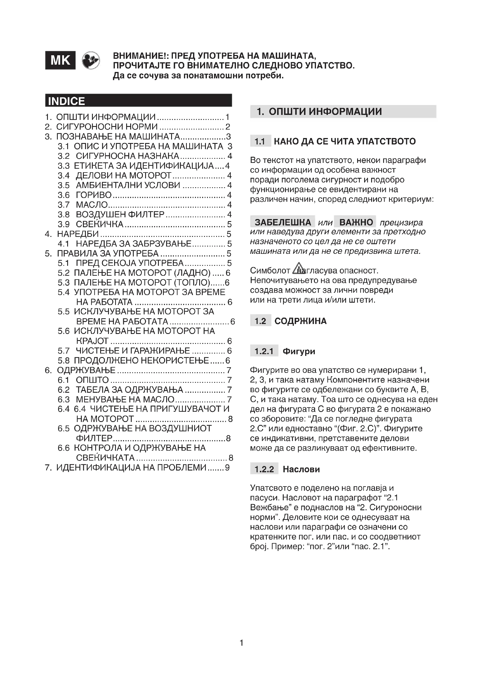 Упатсвото е поделено на поглавја и пасуси. Насловот на параграфот “2.1 Вежбање” е поднаслов на “2. Сигуроносни норми”. Деловите кои се однесуваат на наслови или параграфи се означени со кратенките пог. или пас. и со соодветниот број. Пример: “пог. 2”или “пас. 2.1”. ВНИМАНИЕ!: ПРЕД УПОТРЕБА НА МАШИНАТА, ПРОЧИТАЈТЕ ГО ВНИМАТЕЛНО СЛЕДНОВО УПАТСТВО. Да се сочува за понатамошни потреби.