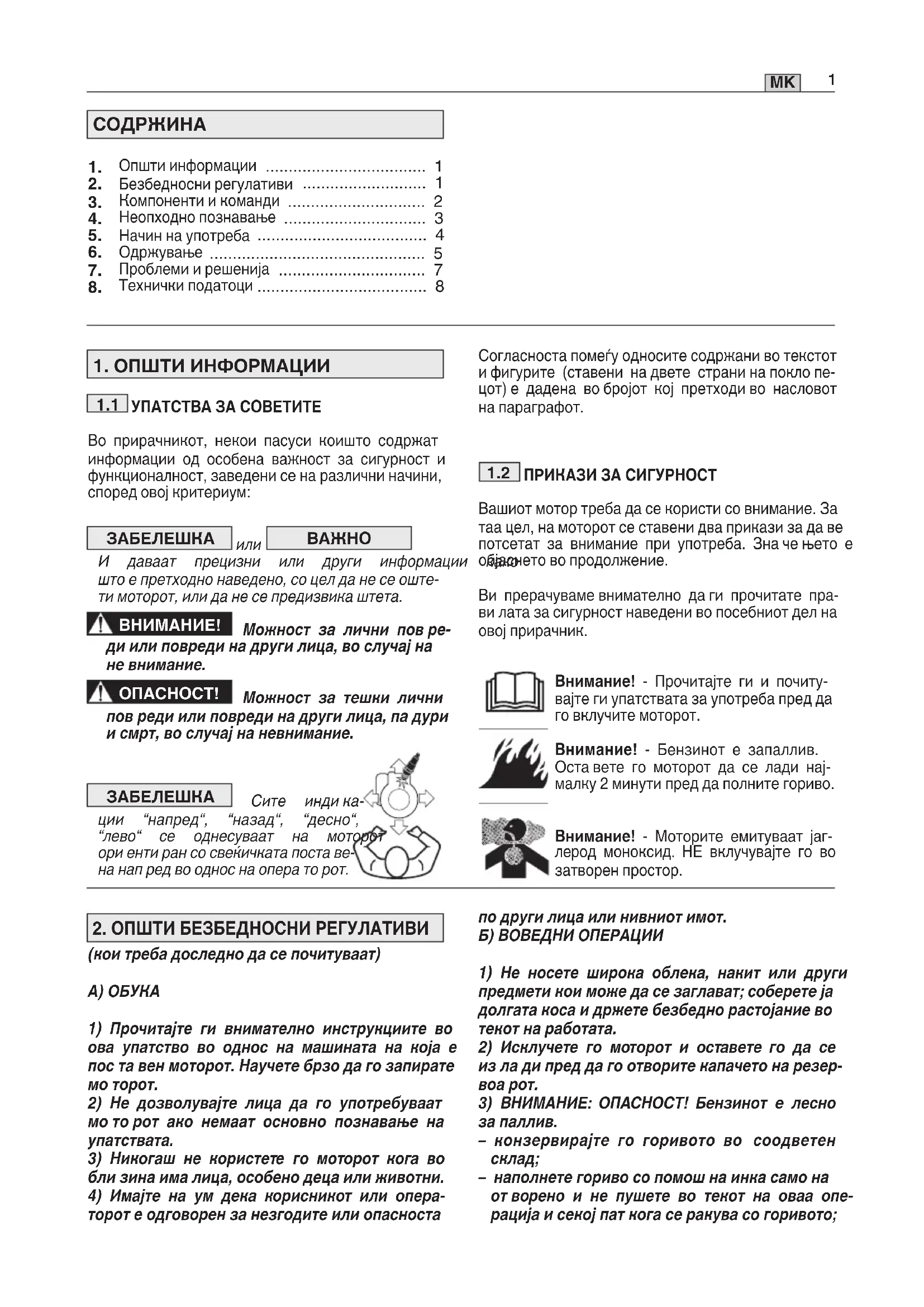 соодветствува на минимален режим. ли тет може да го оштетат моторот и да ја заг розат личната безбедност. E) ЕМИСИИ Процесот на согорување генерира токсични супстанци, како на пр. јаглерод моноксид, азотни оксиди и јаглеводород. Важно е да се контролираат овие супстанци затоа што може да реагираат со фотохемиски смог, како и со директна изложеност на сончева светлина. Јаглерод моноксид не реагира на ист начин на изложеност на сончева светлина, но сепак може да се смета како токсичен. Нашите машини се опремени со системи за намалување на емисијата за супстанците наведени погоре.